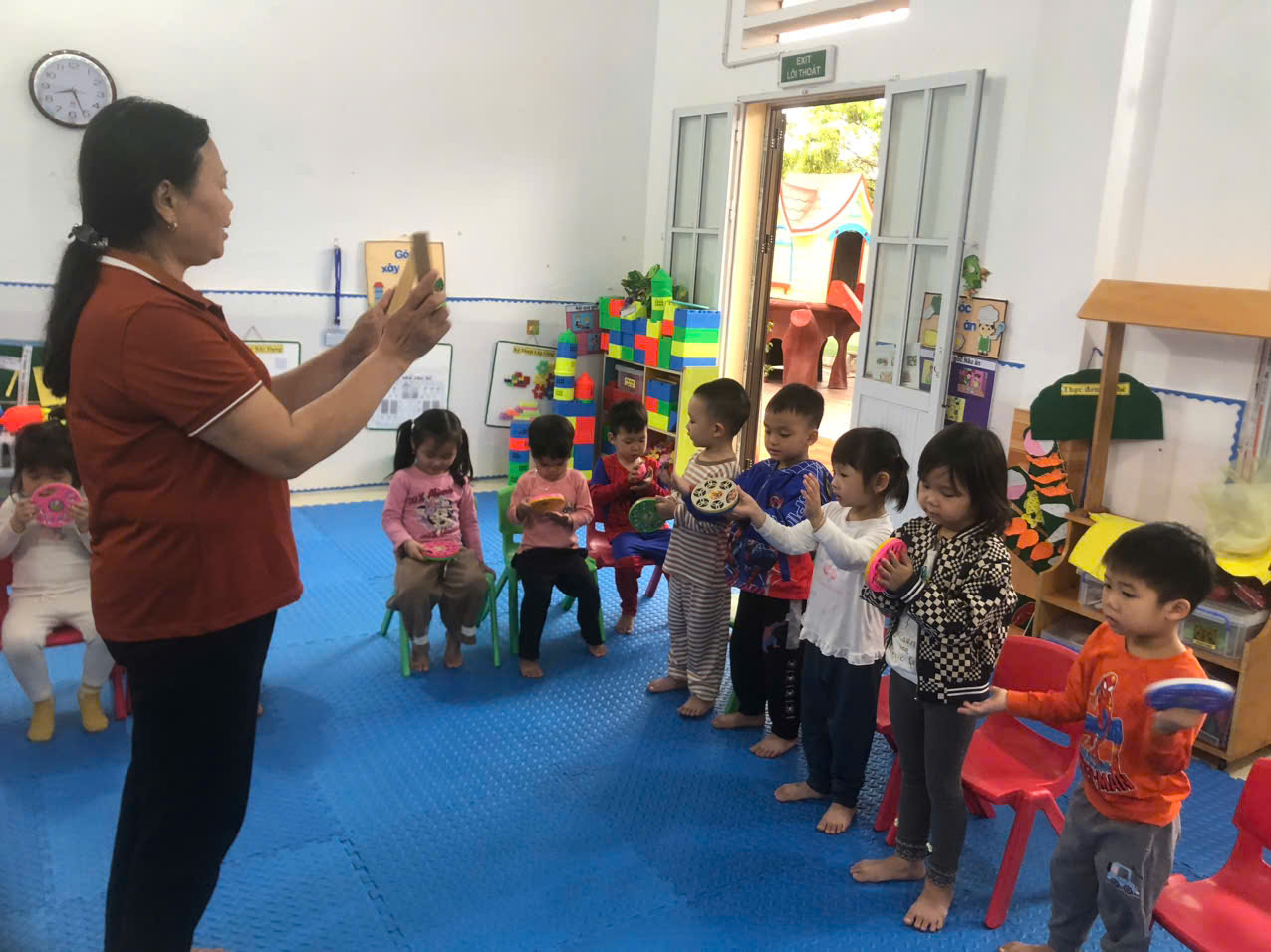 Cô cho trẻ hát và vận động vỗ tay theo nhịp.