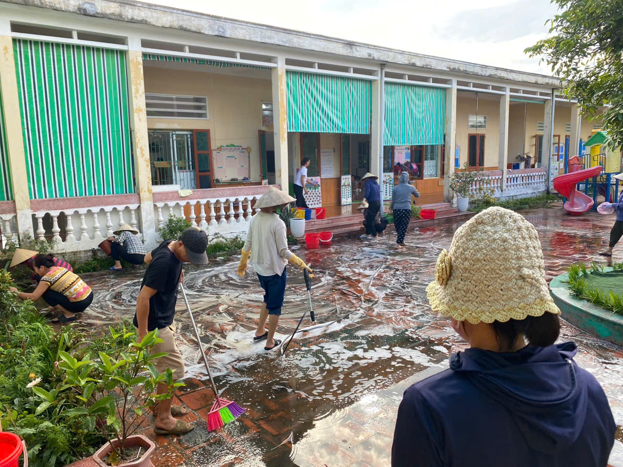 Mặc dù, thời tiết nắng nóng, nhưng các bác phụ huynh và các cán bộ, giáo viên nhân viên nhà trường vẫn rất tích cực dọn dẹp, tổng vệ sinh đánh rửa sân, đồ dùng, đồ chơi sạch sẽ để các con chào mừng năm học mới
