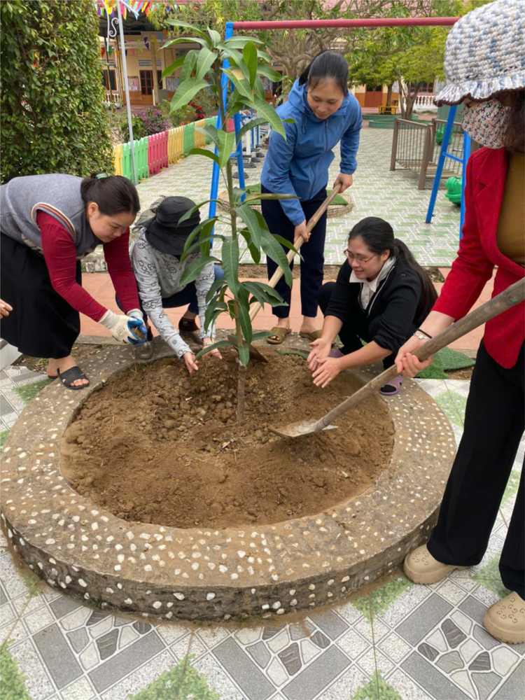 Phó hiệu trưởng phụ trách trường đ.c Nguyễn Thị Ngọc Trâm và đ.c Trần Thị Tý đã chỉ đạo các giáo viên, nhân viên trong trường xác định địa điểm trồng cây, kỹ thuật trồng cây, lựa chọn các loại cây trồng có khả năng sinh trưởng, phát triển, thích nghi với điều kiện thổ nhưỡng, khí hậu và nhu cầu sử dụng của trường, chọn cây giống có chất lượng tốt tại các trung tâm giống cây trồng của địa phương để tiến hành trồng tại một số vị trí trong trường để tạo bóng mát và quả ngọt cho các bé tham gia hoạt động học và chơi.
