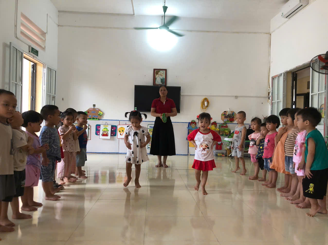 Sau khi, khổ động và tập bài tập phát triển chung xong các con cùng nhau bước vào phần trọng động với vận động cơ bản: Đi kiễng gót