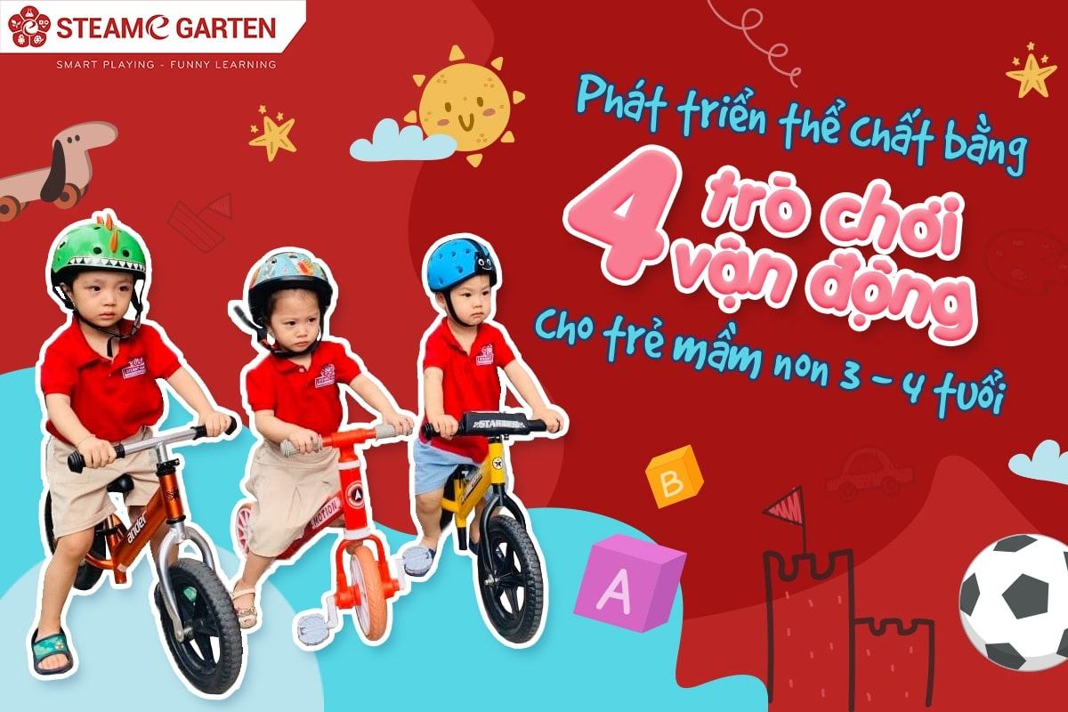 Trẻ 3 – 4 tuổi có thể thực hiện các động tác vận động toàn thân, thậm chí chơi các môn thể thao đòi hỏi sự linh hoạt trong chuyển động cơ thể như đá cầu, leo trèo, lộn xà…, tuy chưa thể thành thạo nhưng các em cũng có thể thực hiện được các hoạt động này ở mức cơ bản. Một vài hoạt động thể chất các em hãy thực hiện thường là là chơi nhảy dây, nhảy lò cò 1 chân, chạy, đá bóng….