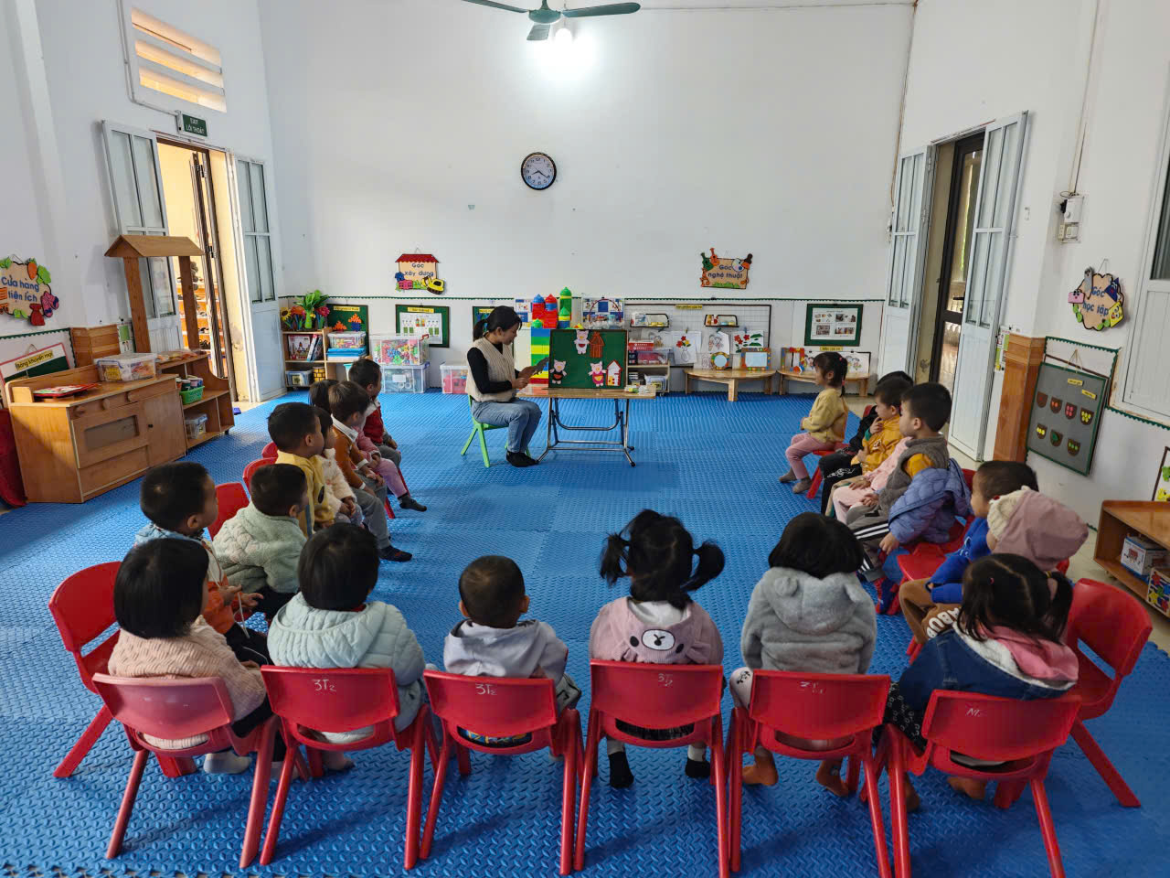 Ngoài ra, khi nghe kể chuyện, trẻ được phát triển khả năng ngôn ngữ, tư duy tưởng tượng và kỹ năng lắng nghe. Trẻ biết gọi tên nhân vật, mô tả hành động, và có thể kể lại câu chuyện bằng lời của mình. Đây cũng là cơ hội để trẻ bày tỏ cảm xúc – vui khi lợn con thông minh, lo lắng khi chó sói đến.