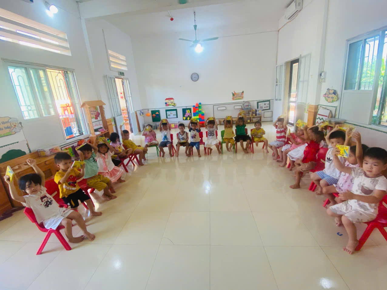 - Cô chia trẻ về các nhóm để trẻ cùng nhau khám phá, thảo luận về hộp bút màu mà các con có
