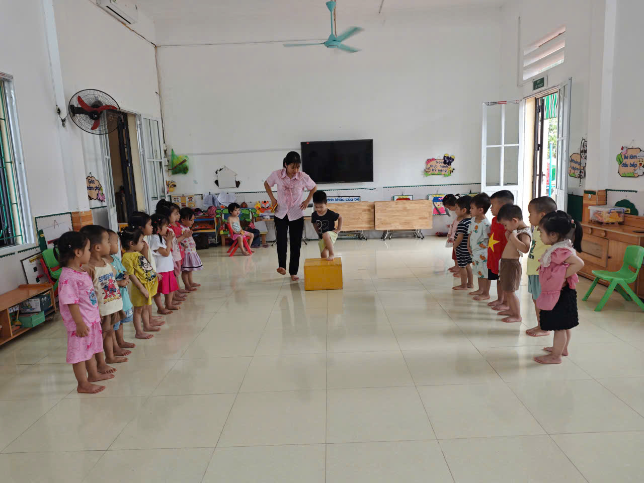 Trong quá trình dạy, giáo viên hướng dẫn trẻ quan sát, lắng nghe hiệu lệnh và thực hiện đúng động tác: Bước từng chân lên bục, giữ thăng bằng, rồi bước xuống nhẹ nhàng. Cô luôn ở bên hỗ trợ, khích lệ, đảm bảo an toàn cho trẻ.