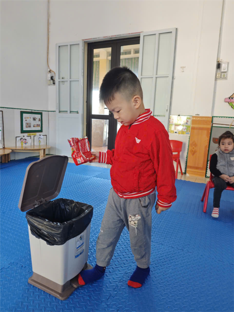 Hình ảnh trẻ thực hành bỏ rác đúng nơi quy định