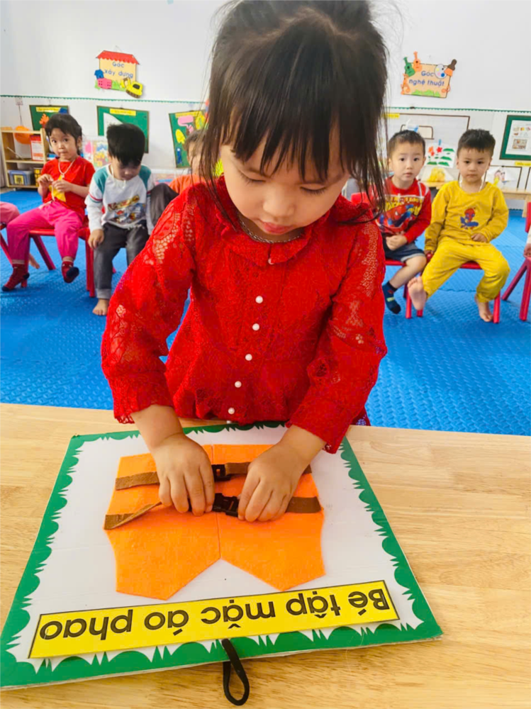 Thông qua hoạt động này, trẻ được rèn luyện kỹ năng tự phục vụ như biết cách mặc, cài khóa, điều chỉnh áo vừa vặn với cơ thể. Đồng thời, trẻ cũng hiểu được tầm quan trọng của việc mặc áo phao khi đi bơi hoặc tham gia các hoạt động gần sông, hồ.