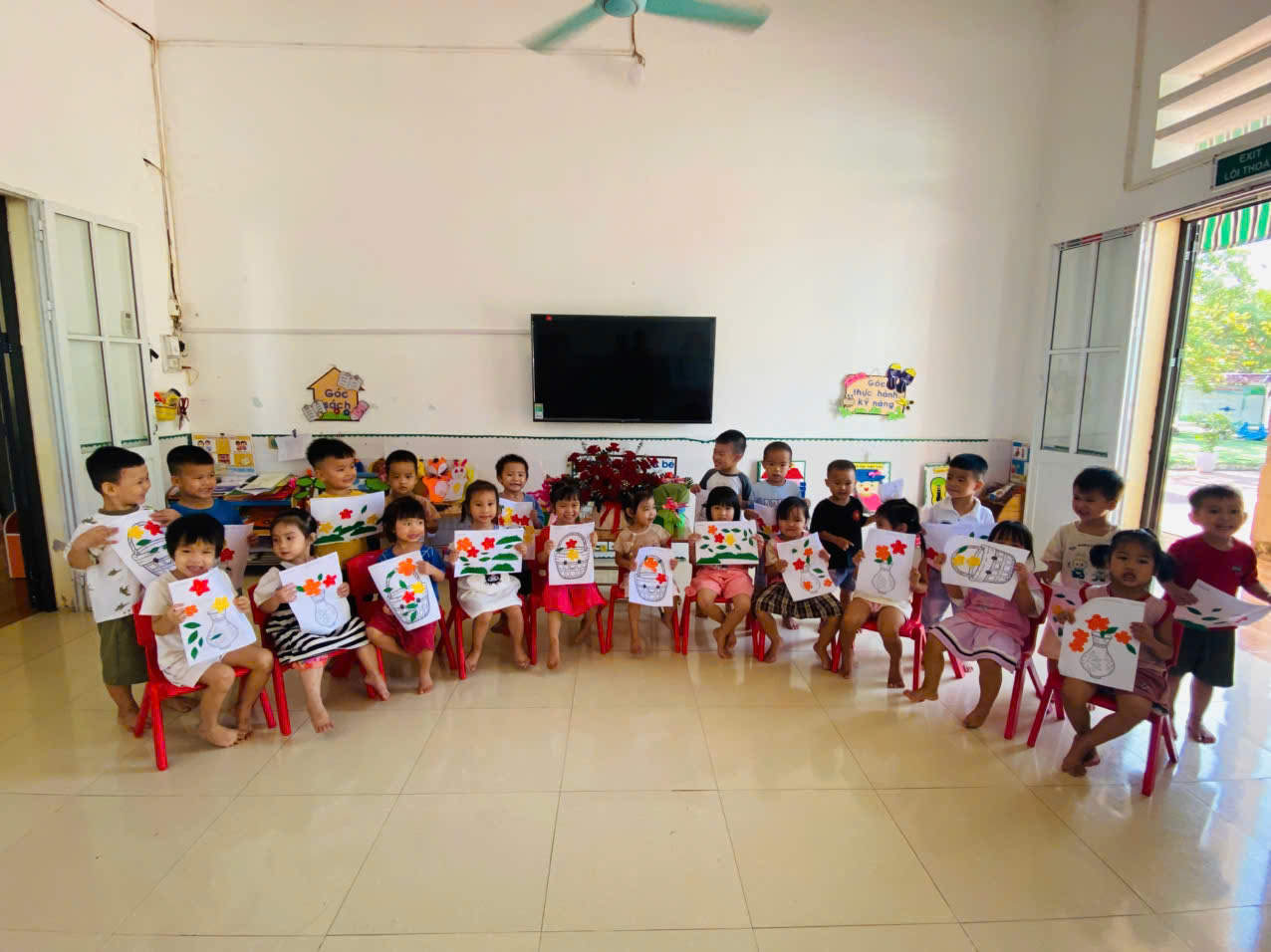 Bên cạnh đó, hoạt động dán hoa còn giúp phát triển sự khéo léo của đôi tay, rèn luyện kỹ năng phối hợp giữa mắt và tay, khả năng quan sát, lựa chọn màu sắc và sắp xếp bố cục. Khi cô trò cùng trò chuyện về ý nghĩa của ngày 20/10, trẻ học được cách quan tâm, chia sẻ và thể hiện cảm xúc một cách tích cực.