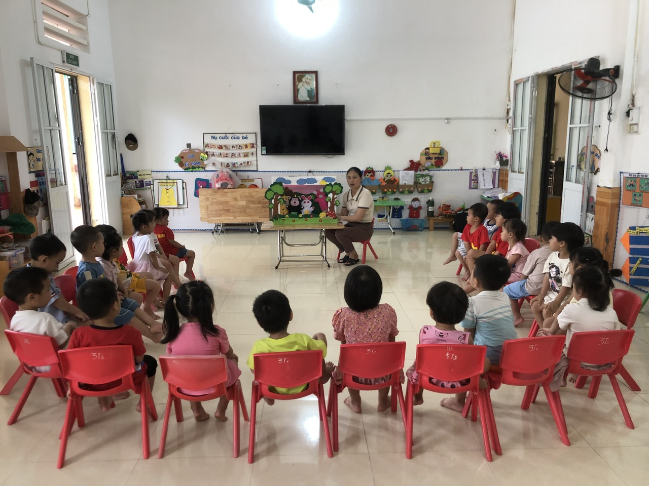 Ảnh 1: Các bé lớp 3 tuổi 2 chú ý nghe cô kể chuyện.