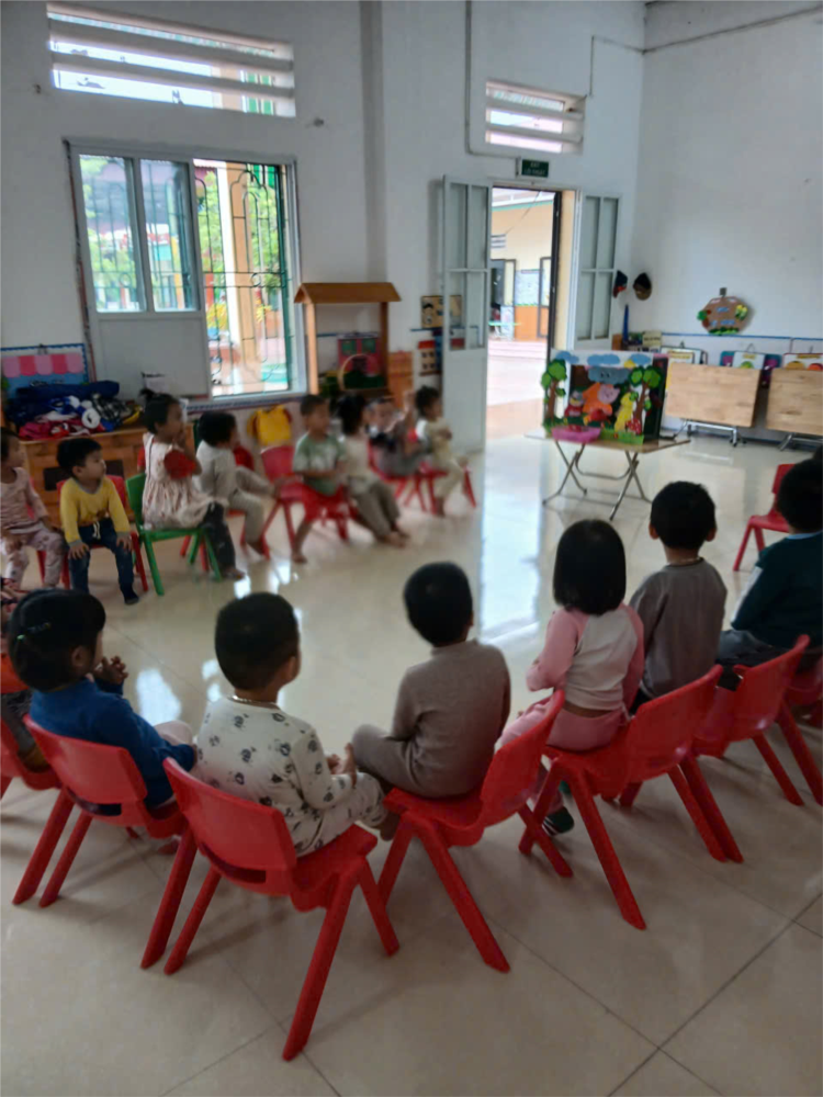 Ảnh bé lớp 3 tuổi 2 nghe cô kể truyện bằng xa bàn.