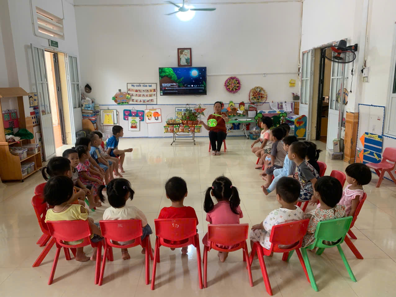 - Cô và trẻ cùng xem câu chuyện: “Đóm đóm cầm đèn lồng”. Trẻ biết về ngày tết trung thu sẽ có đèn ông sao, đèn lồng, mũ công chúa…