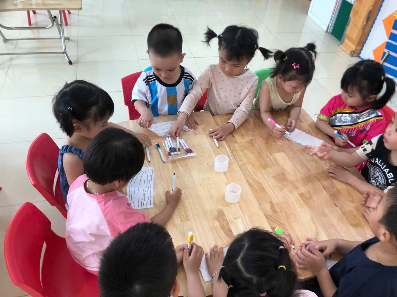Ảnh các bé lớp 3T2 là thí nghiệm cầu vồng giấy.