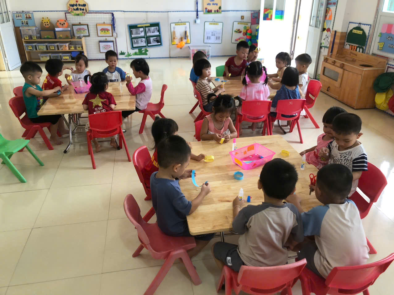 Ảnh 1: Các bé lớp 3 tuổi 2 làm vòng đeo tay tặng bạn.