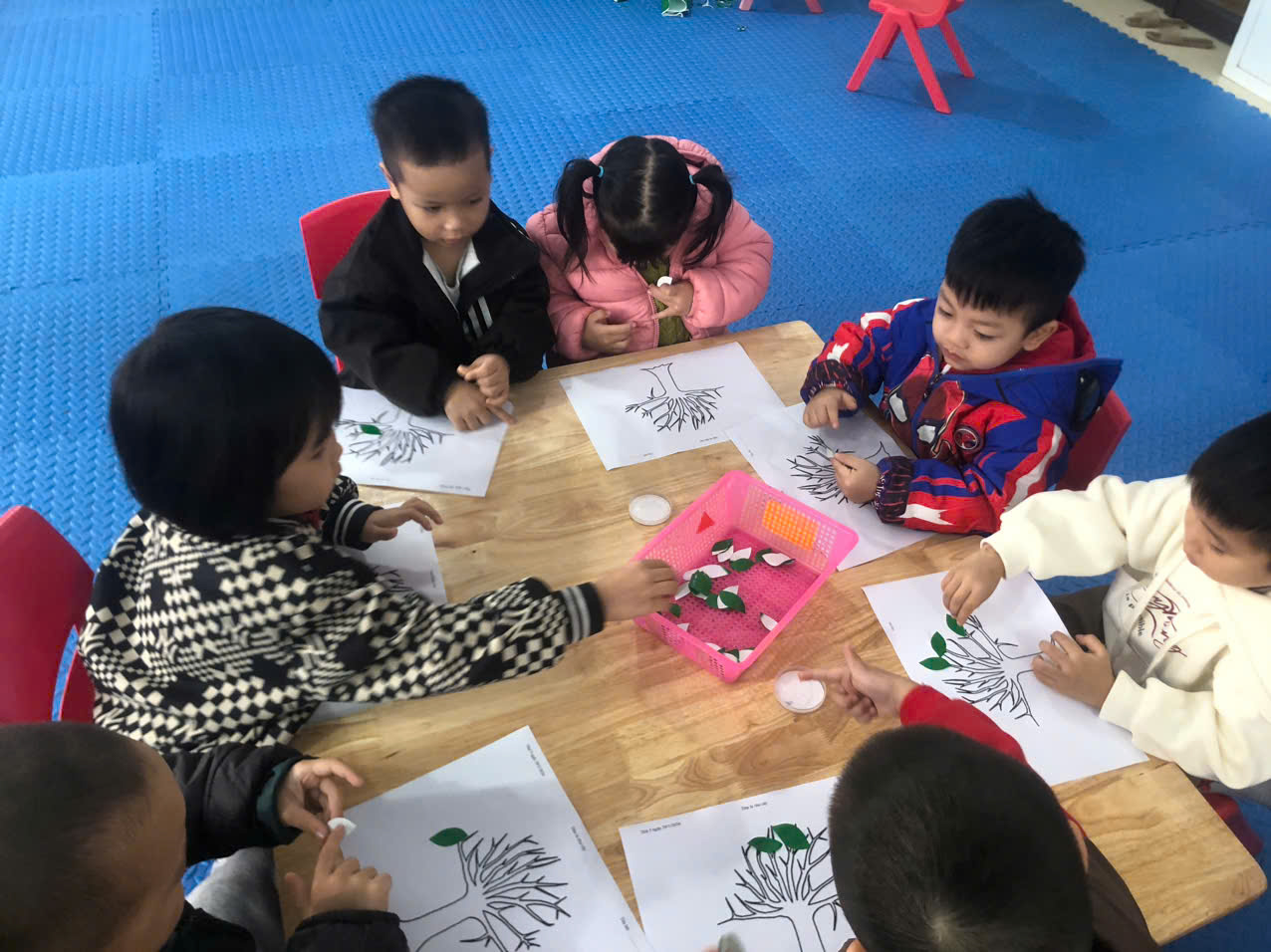 Trẻ quan sát mẫu, nhận biết vị trí dán lá trên cây.
