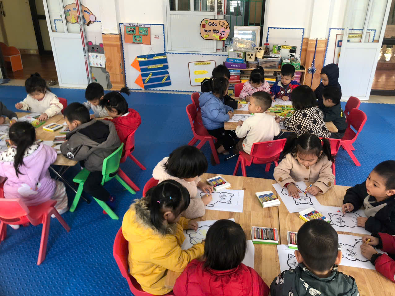 - Cô nói cách ngồi cách cầm bút cho trẻ. Cô cho trẻ tô mô phỏng