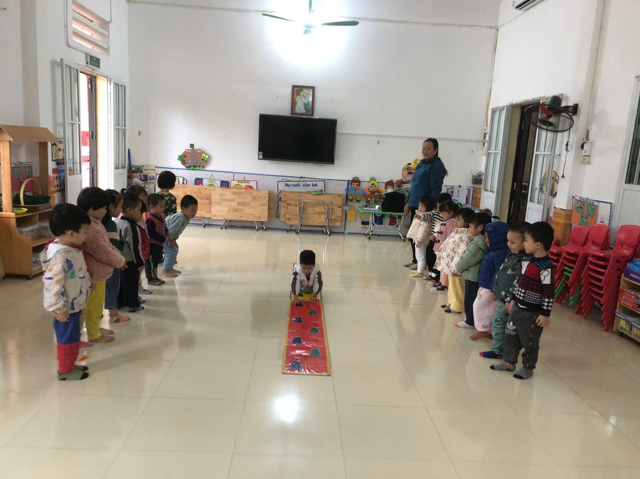 Sau khi, khởi động và tập bài tập phát triển chung xong các con cùng nhau bước vào phần trọng động với vận động cơ bản: Bò trong đường hẹp.