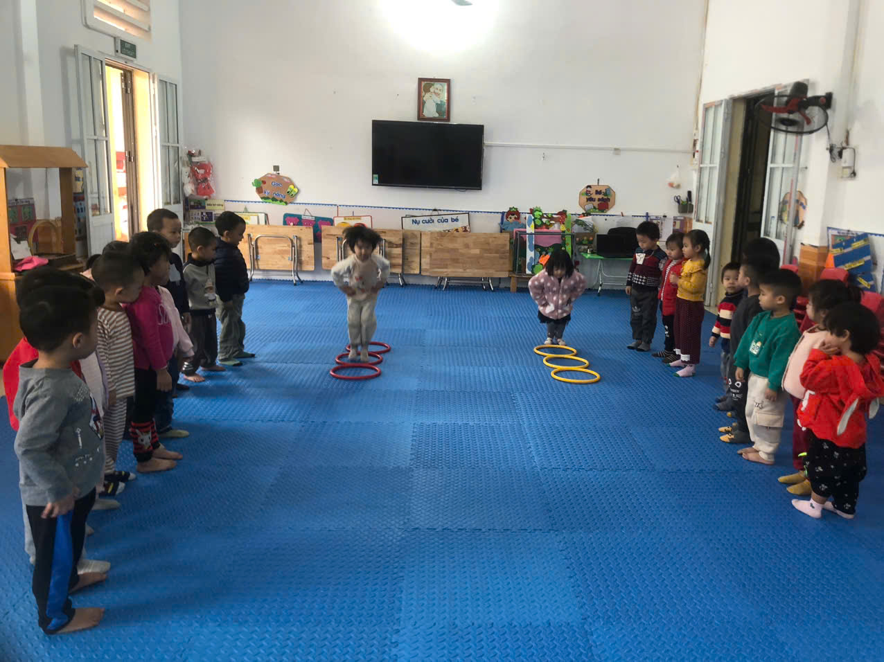 Sau khi, khổ động và tập bài tập phát triển chung xong các con cùng nhau bước vào phần trọng động với vận động cơ bản: Bật qua các ô vòng.