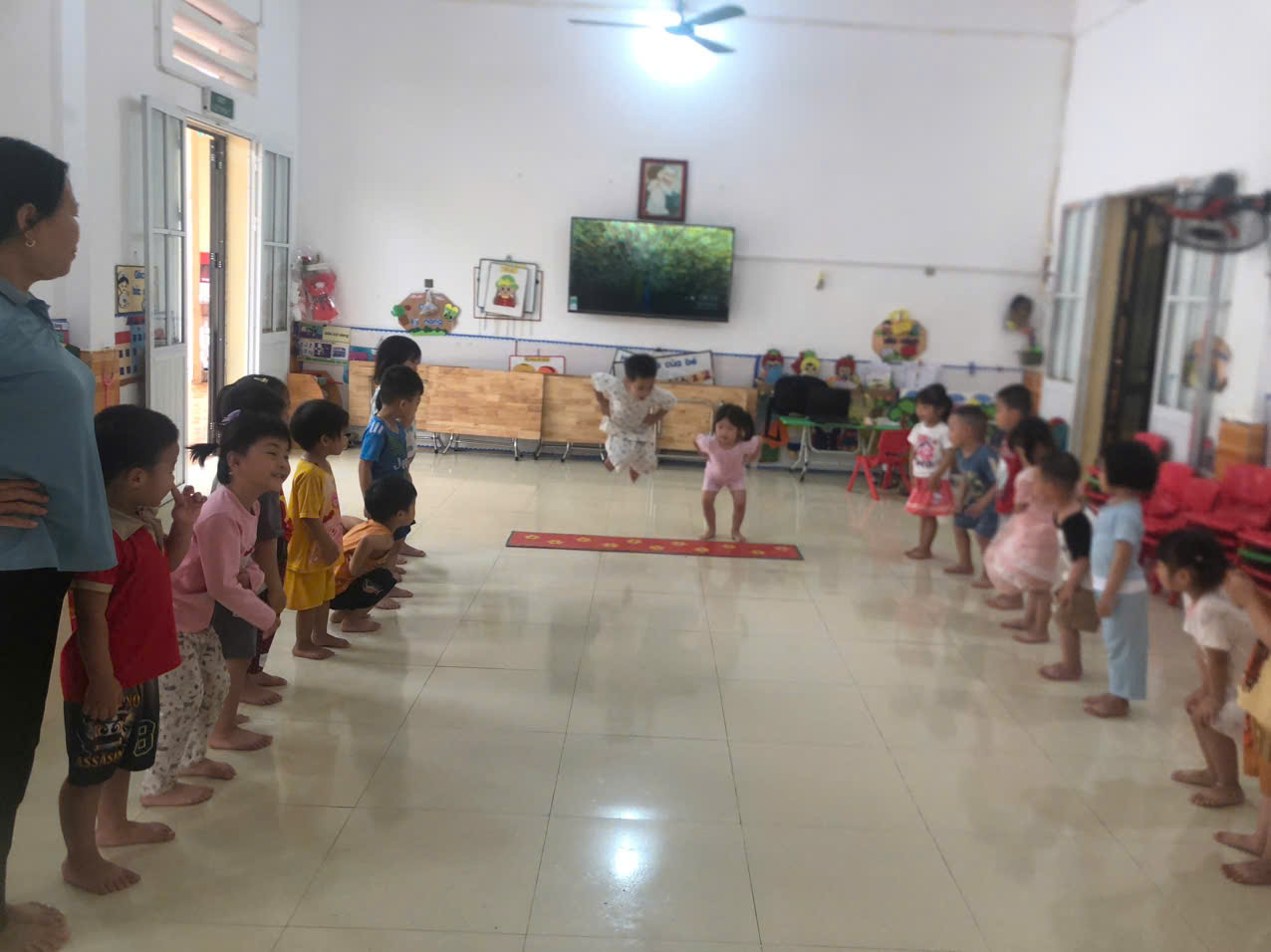 Sau khi, khổ động và tập bài tập phát triển chung xong các con cùng nhau bước vào phần trọng động với vận động cơ bản: Bật xa 25cm.