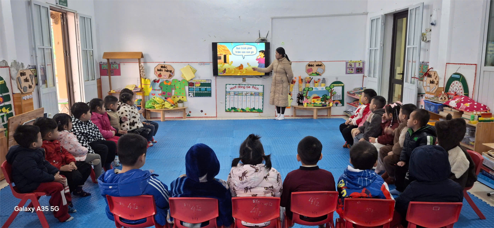 Trong giờ học, giáo viên sử dụng tranh ảnh, video minh họa sinh động để giới thiệu từng giai đoạn phát triển của con gà. Trẻ chăm chú quan sát, lắng nghe và trả lời các câu hỏi gợi mở, thể hiện sự hứng thú và tò mò khám phá thế giới xung quanh.