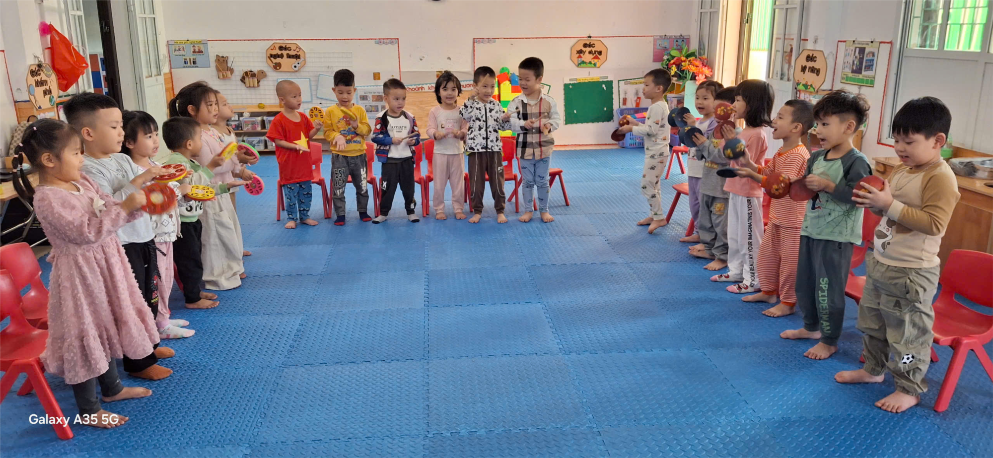Trong phần luyện tập, cô hướng dẫn trẻ cầm dụng cụ đúng cách và thực hiện động tác vỗ đệm nhẹ nhàng theo từng câu hát. Những tiếng “tách – tách” của phách tre vang lên đều đặn, hòa quyện cùng giai điệu bài hát tạo nên không khí đầy vui tươi. Cô kiên nhẫn chỉnh nhịp cho từng trẻ, động viên những bạn còn lúng túng và khích lệ các bạn thực hiện đúng tiết tấu. Bằng sự khéo léo và linh hoạt, trẻ dần cảm nhận được nhịp chậm và biết phối hợp nhịp nhàng hơn trong từng lần vỗ đệm.