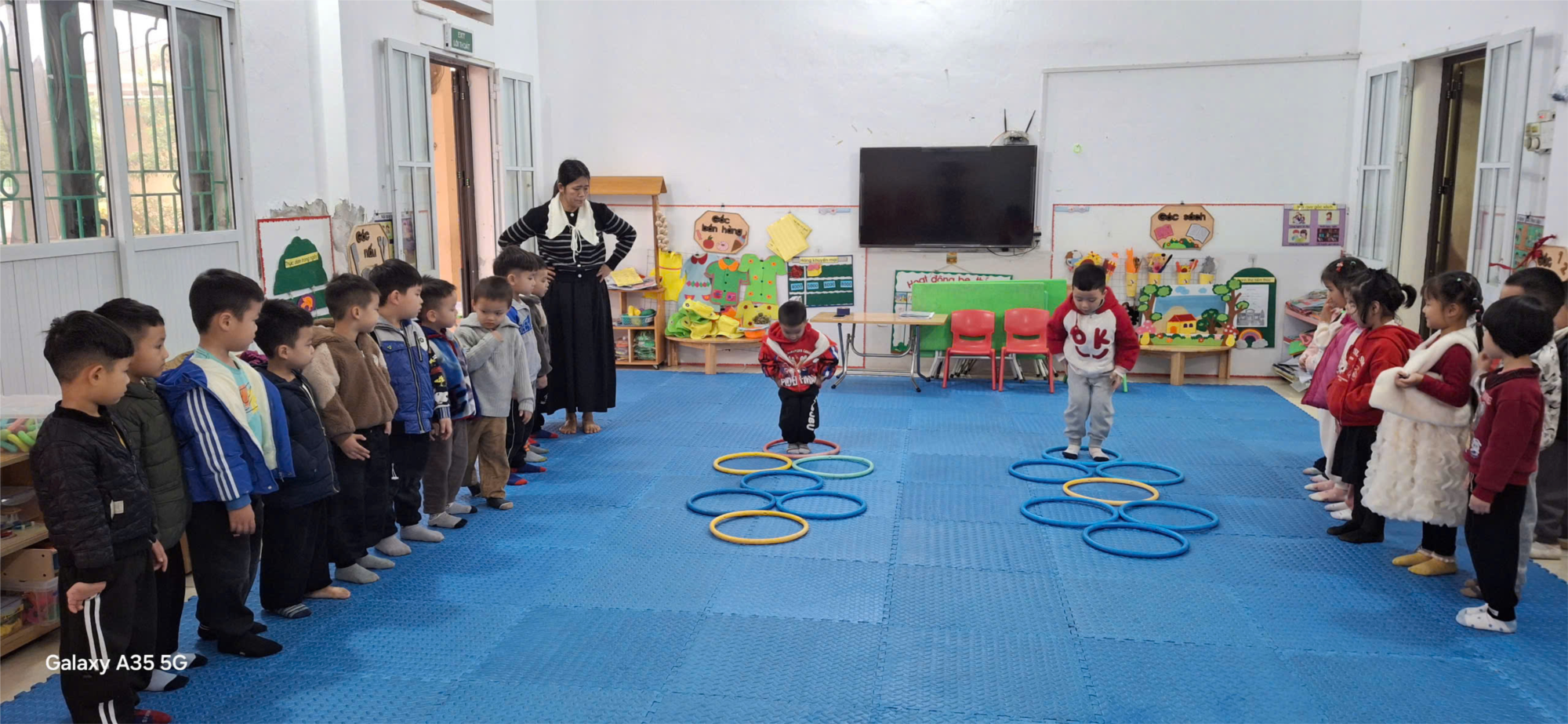 Quá trình luyện tập được lồng ghép thông qua các hình thức thi đua, trò chơi vận động phù hợp, tạo hứng thú và khuyến khích trẻ tích cực tham gia. Dưới sự hỗ trợ kịp thời của giáo viên, trẻ thực hiện động tác ngày càng tự tin và đúng nhịp.