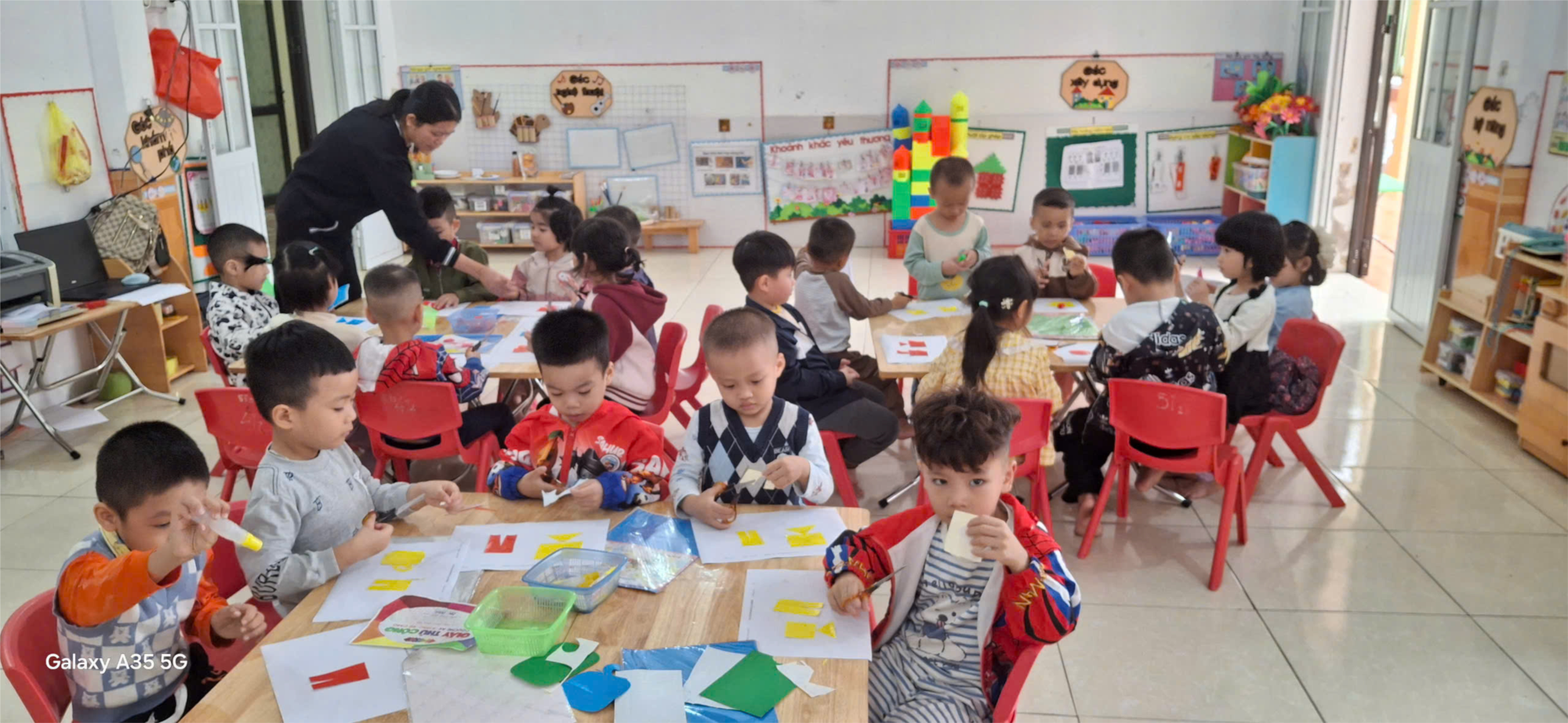 Trong quá trình hoạt động, các bé rất tập trung và hào hứng. Cô giáo hướng dẫn trẻ cắt hình tròn, hình vuông, hình chữ nhật để tạo thành các đồ vật khác nhau, sau đó dán lên giấy theo bố cục mà trẻ tưởng tượng. Có bé khéo léo dán được chiếc bàn ăn xinh xắn, có bé lại sáng tạo ra một gian bếp nhỏ đầy màu sắc. Không khí lớp học vui tươi, rộn ràng tiếng trò chuyện, tiếng cười hồn nhiên của trẻ khi cùng nhau chia sẻ ý tưởng sáng tạo.