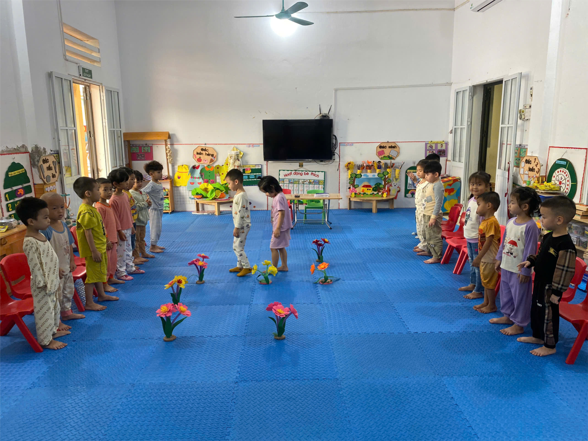 Kết thúc tiết học, cô cùng các bé thực hiện phần thả lỏng nhẹ nhàng, trò chuyện về cảm nhận sau khi vận động. Ai nấy đều vui vẻ, hào hứng và chia sẻ rằng mình cảm thấy khỏe hơn, vui hơn khi được tham gia cùng các bạn. Hoạt động “Đi thay đổi hướng theo vật chuẩn (4 – 5 điểm zic zắc)” đã mang lại cho trẻ niềm vui vận động, giúp phát triển các kỹ năng vận động cơ bản, đồng thời hình thành tinh thần tự tin, chủ động và yêu thích các hoạt động thể chất – nền tảng quan trọng cho sự phát triển toàn diện của trẻ mầm non.