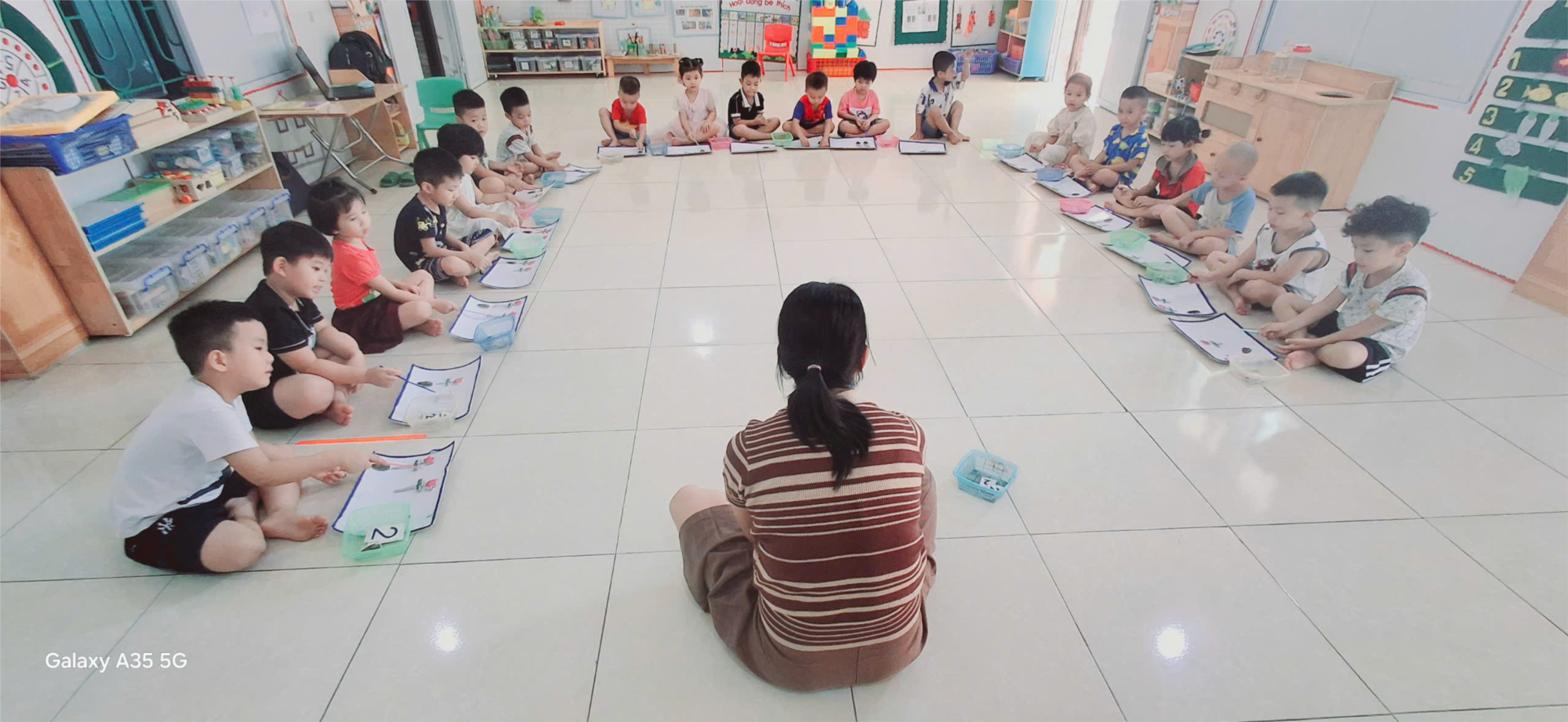 Trong giờ học, dưới sự hướng dẫn tận tình của cô giáo, các bé đã được quan sát, so sánh và đếm số lượng thông qua những đồ vật quen thuộc … Từng bước, trẻ học cách chỉ tay, đếm chính xác “một – hai”, đồng thời làm quen với thẻ số 2 và nhận dạng đặc điểm của con số. Không khí lớp học trở nên vui tươi, sôi động hơn qua các trò chơi củng cố như “Ai nhanh hơn”, “Tìm số 2”, giúp kiến thức được khắc sâu một cách tự nhiên.