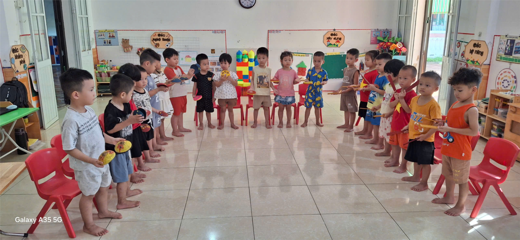 Ngoài vỗ tay theo tiết tấu chậm, trẻ còn được làm quen và sử dụng một số dụng cụ âm nhạc đơn giản như sắc xô, phách tre, mõ dừa… Việc kết hợp dụng cụ giúp trẻ thêm hứng thú, tạo âm thanh sinh động và phong phú hơn cho bài hát. Qua đó, các con học được cách sử dụng nhạc cụ đúng lúc, đúng nhịp, biết phối hợp nhịp nhàng giữa hát – vận động – chơi nhạc cụ. Hoạt động này không chỉ nuôi dưỡng khả năng cảm thụ âm nhạc, mà còn rèn cho trẻ sự khéo léo, tính tập trung và tinh thần hợp tác trong nhóm.