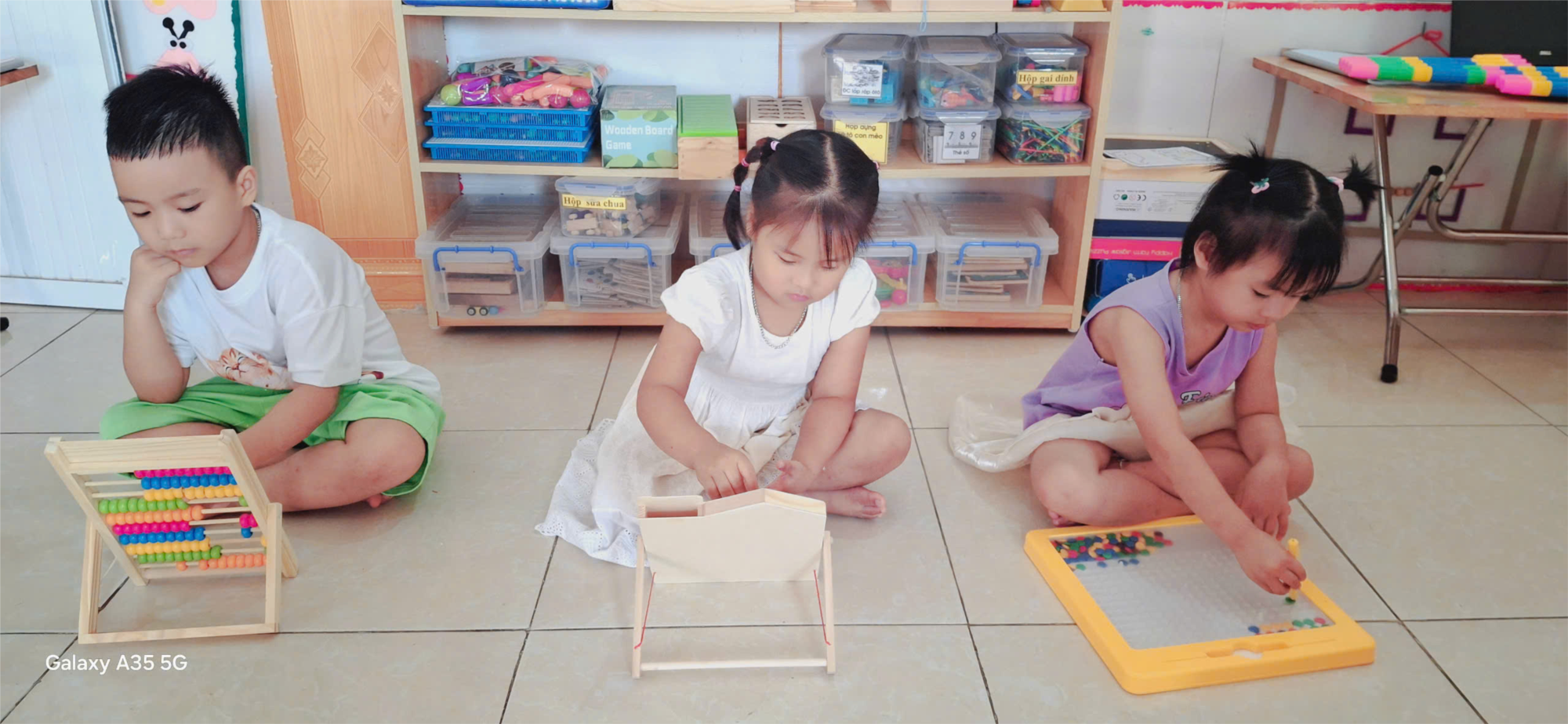 Tại góc chơi, cô giáo chuẩn bị nhiều học liệu phong phú như khối gỗ, que tính, hạt cườm, hình khối, và bảng xếp số. Các bé được chia nhóm nhỏ cùng nhau thực hiện nhiệm vụ: xếp hình theo mẫu, đếm và so sánh số lượng, hay tìm đồ vật giống nhau. Hoạt động vừa giúp trẻ phát triển tư duy logic, khả năng quan sát, vừa rèn kỹ năng hợp tác và chia sẻ với bạn trong khi chơi.