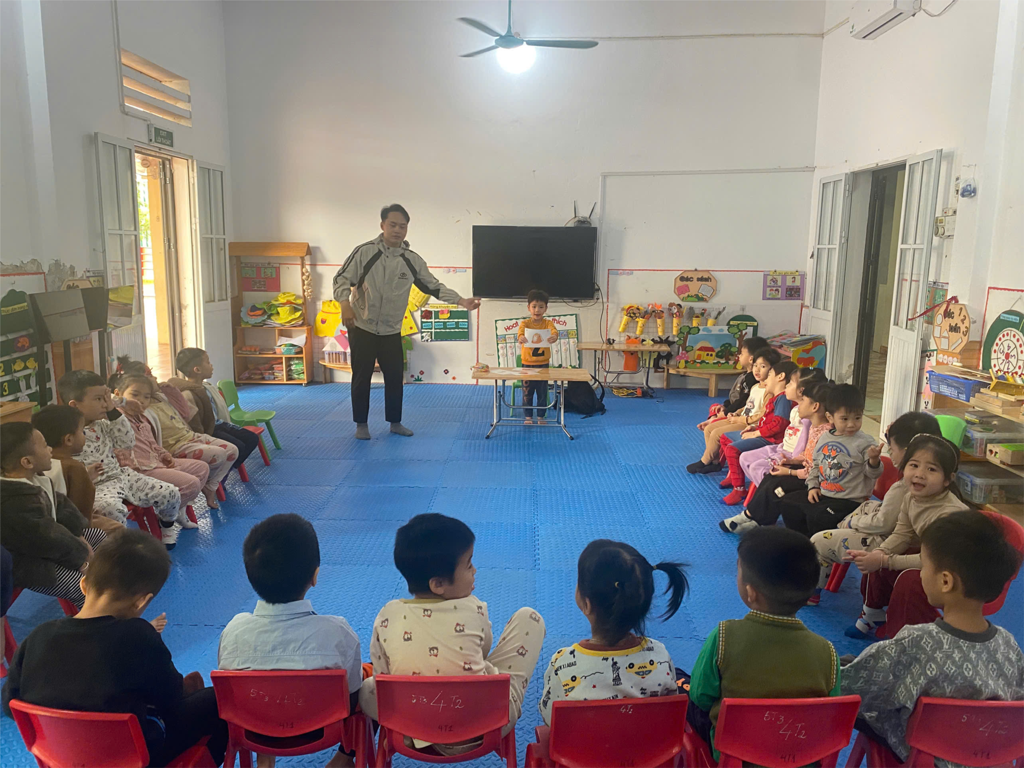 Ở phần tiếp theo, thầy tổ chức hoạt động hát theo bài hát tiếng Anh vui nhộn kết hợp vận động để rèn phát âm và nhịp điệu. Trẻ hào hứng lặp lại lời bài hát, mạnh dạn thể hiện bản thân trước lớp. Cuối buổi, thầy cho trẻ thực hành giao tiếp thông qua các mẫu câu hỏi–đáp ngắn như “What’s this?”, “What color is it?”, giúp trẻ hình thành phản xạ ngôn ngữ tự nhiên. Buổi học kết thúc trong sự thích thú và tự tin của các bé khi được trải nghiệm tiếng Anh thực tế, sinh động.