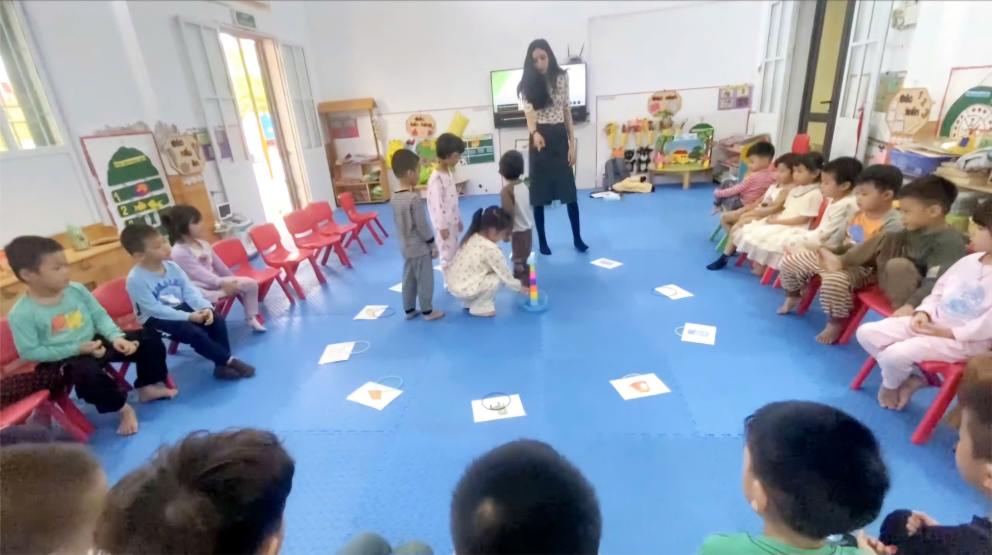 Trong hoạt động chính, thầy giáo kết hợp nhiều hình thức trực quan như thẻ hình ảnh, bài hát, trò chơi vận động để trẻ dễ dàng ghi nhớ từ vựng và các mẫu câu đơn giản. Các con được học những chủ đề quen thuộc như màu sắc, con vật, đồ vật và câu chào hỏi cơ bản. Việc lồng ghép bài hát và trò chơi giúp trẻ tiếp thu tự nhiên, không áp lực, đồng thời tạo cơ hội cho từng bé nói tiếng Anh một cách tự tin và đầy hào hứng.