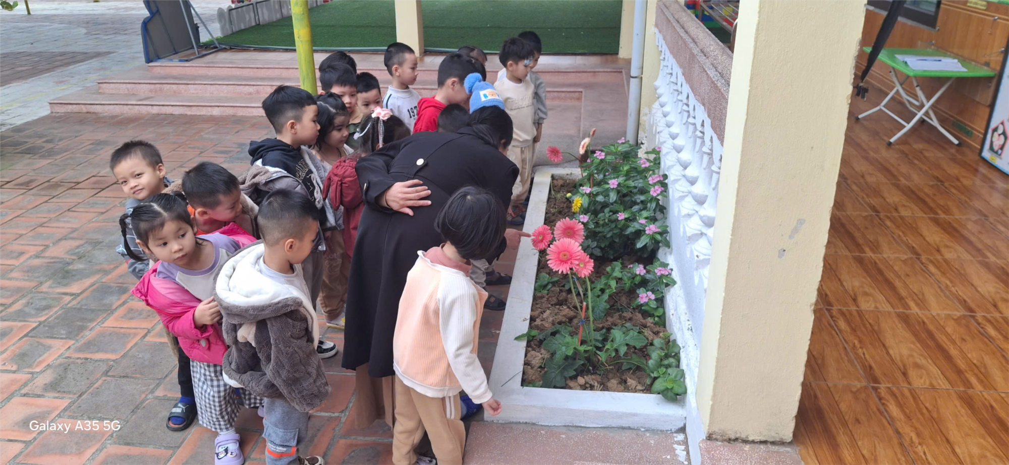 Bên cạnh hoạt động quan sát, cô giáo tổ chức cho trẻ thực hành đếm số bông hoa đồng tiền trên từng chậu hoa. Trẻ được đếm to, rõ ràng, phối hợp cùng bạn, giúp củng cố kỹ năng đếm, nhận biết số lượng, đồng thời rèn sự tập trung và tính chính xác.