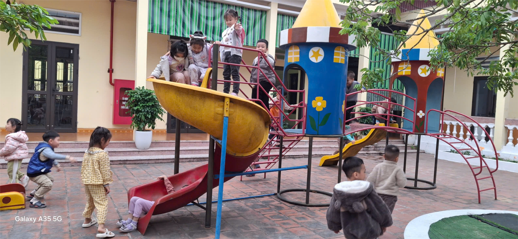 Trong quá trình chơi cầu trượt, trẻ được rèn luyện sự khéo léo, khả năng giữ thăng bằng và phát triển các nhóm cơ lớn. Dưới sự quan sát và hướng dẫn của giáo viên, các bé biết xếp hàng chờ đến lượt, chơi đúng cách, đảm bảo an toàn và hình thành ý thức kỷ luật khi tham gia hoạt động tập thể.