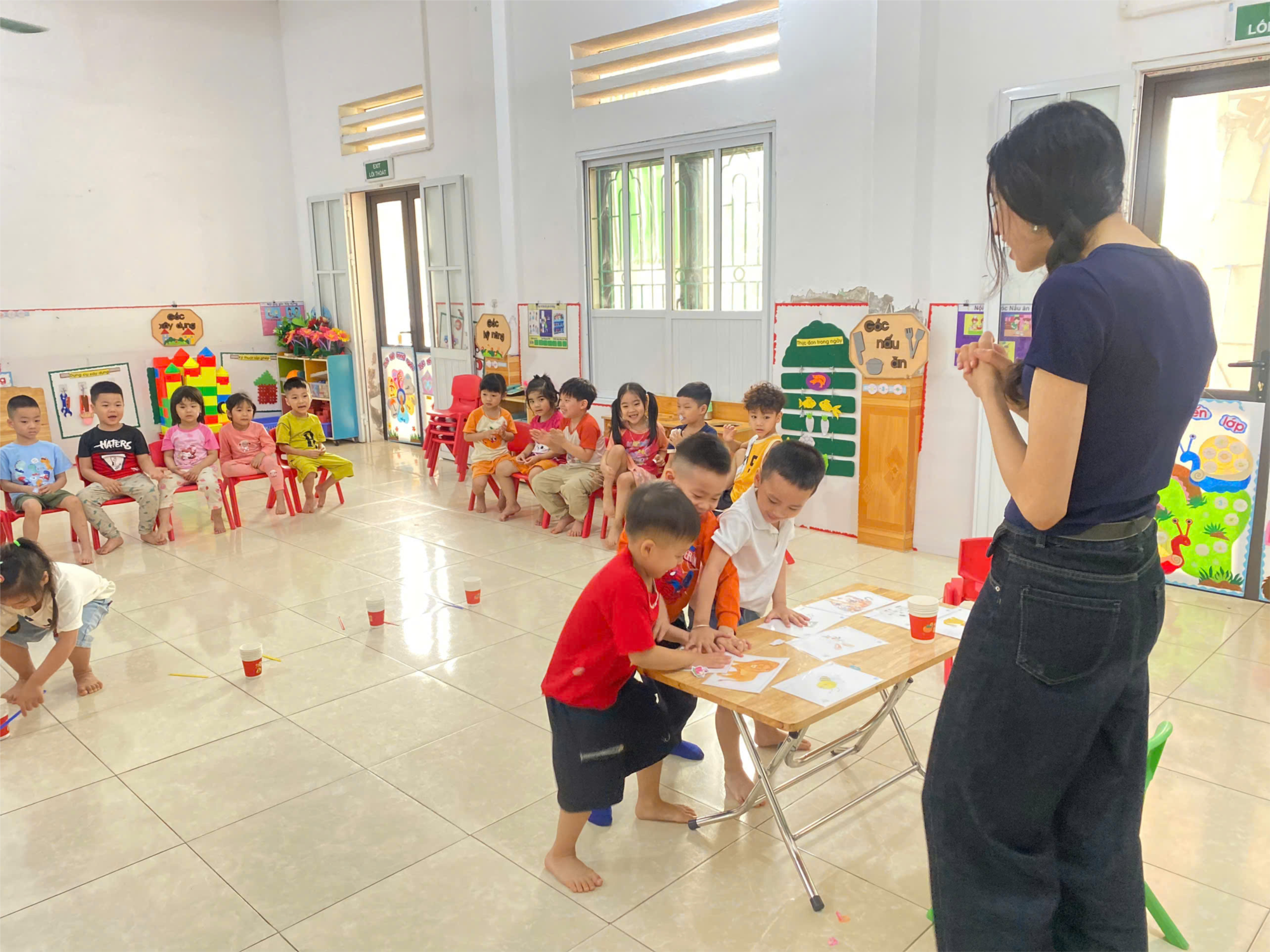 Bên cạnh đó, các trò chơi học tập được lồng ghép xuyên suốt buổi học đã mang lại nhiều tiếng cười và sự thích thú cho trẻ. Các con tham gia trò chơi nhận biết, lựa chọn và gọi tên đúng con vật theo yêu cầu bằng tiếng Anh. Hình thức “học mà chơi, chơi mà học” không chỉ giúp trẻ củng cố kiến thức mà còn phát triển sự nhanh nhẹn, mạnh dạn và nuôi dưỡng niềm yêu thích với môn tiếng Anh ngay từ lứa tuổi mầm non.
