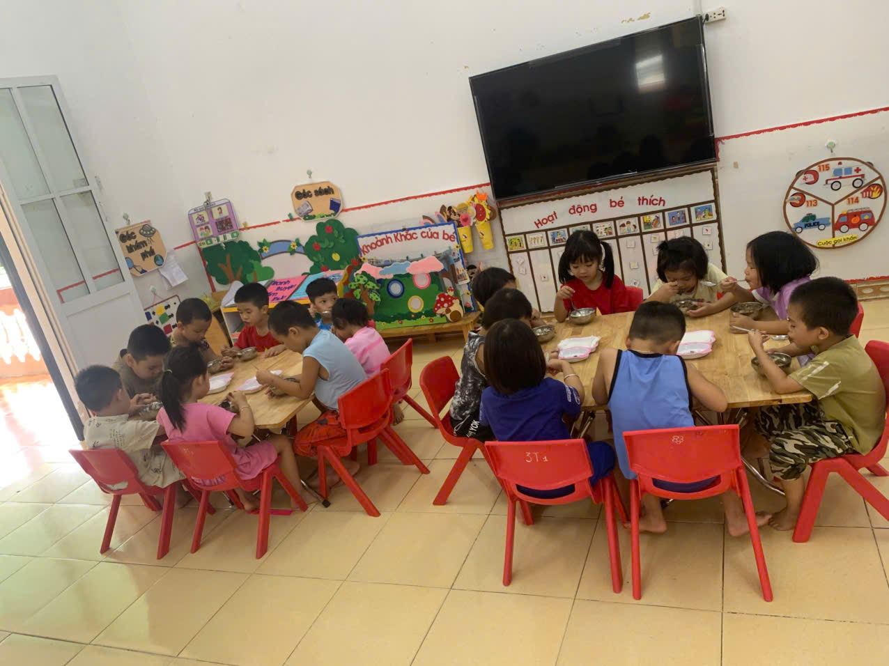 Các bé ngồi ngay ngắn quanh bàn ăn trong lớp, trước mặt là khay cơm gồm cơm trắng, cá sốt cà chua, canh sườn rau củ quả. Trẻ ăn uống vui vẻ, một số bé tự xúc cơm, một số bé vừa ăn vừa trò chuyện với bạn. Không khí bữa ăn ấm áp, thân thiện, thể hiện sự rèn luyện tính tự lập, thói quen ăn uống khoa học và tinh thần gắn kết giữa các bạn nhỏ trong lớp.