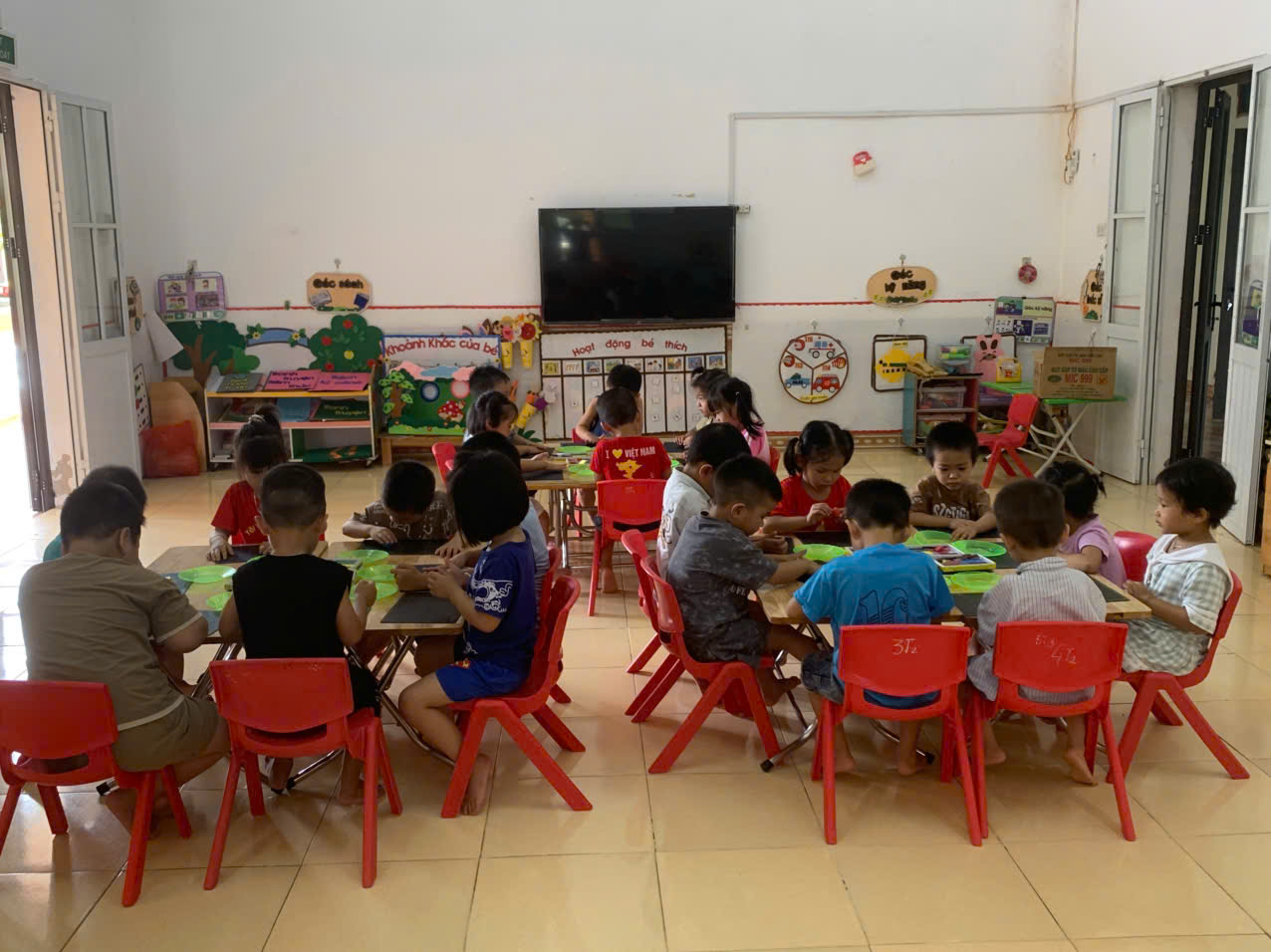 Trong ảnh, các con đang ngồi quanh bàn, say sưa nặn đất với nhiều màu sắc khác nhau. Trẻ dùng đôi bàn tay nhỏ nhắn để vo, lăn, ấn, gắn tạo thành những hình dáng theo ý thích, có bạn nặn khuôn mặt, có bạn nặn bàn tay, có bạn nặn đồ dùng cá nhân. Khuôn mặt các con tỏ ra hào hứng, vui vẻ, thể hiện sự sáng tạo và tập trung. Trên bàn có nhiều sản phẩm nhỏ xinh được trưng bày, tạo nên không khí học tập sôi nổi, đầy màu sắc.