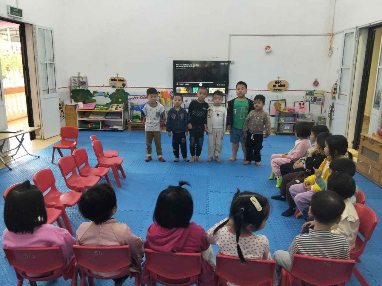 Trong hoạt động luyện đọc bài thơ “Hoa kết trái”, các bạn nhỏ lần lượt được cô giáo mời lên trước lớp đọc thơ. Trẻ mạnh dạn, tự tin thể hiện giọng đọc rõ ràng, đúng nhịp điệu; một số bạn biết kết hợp điệu bộ minh họa phù hợp nội dung. Các bạn phía dưới chú ý lắng nghe, cổ vũ và nhận xét nhẹ nhàng theo hướng dẫn của cô. Cô giáo động viên, sửa sai phát âm và khen ngợi kịp thời để khích lệ sự tự tin của trẻ