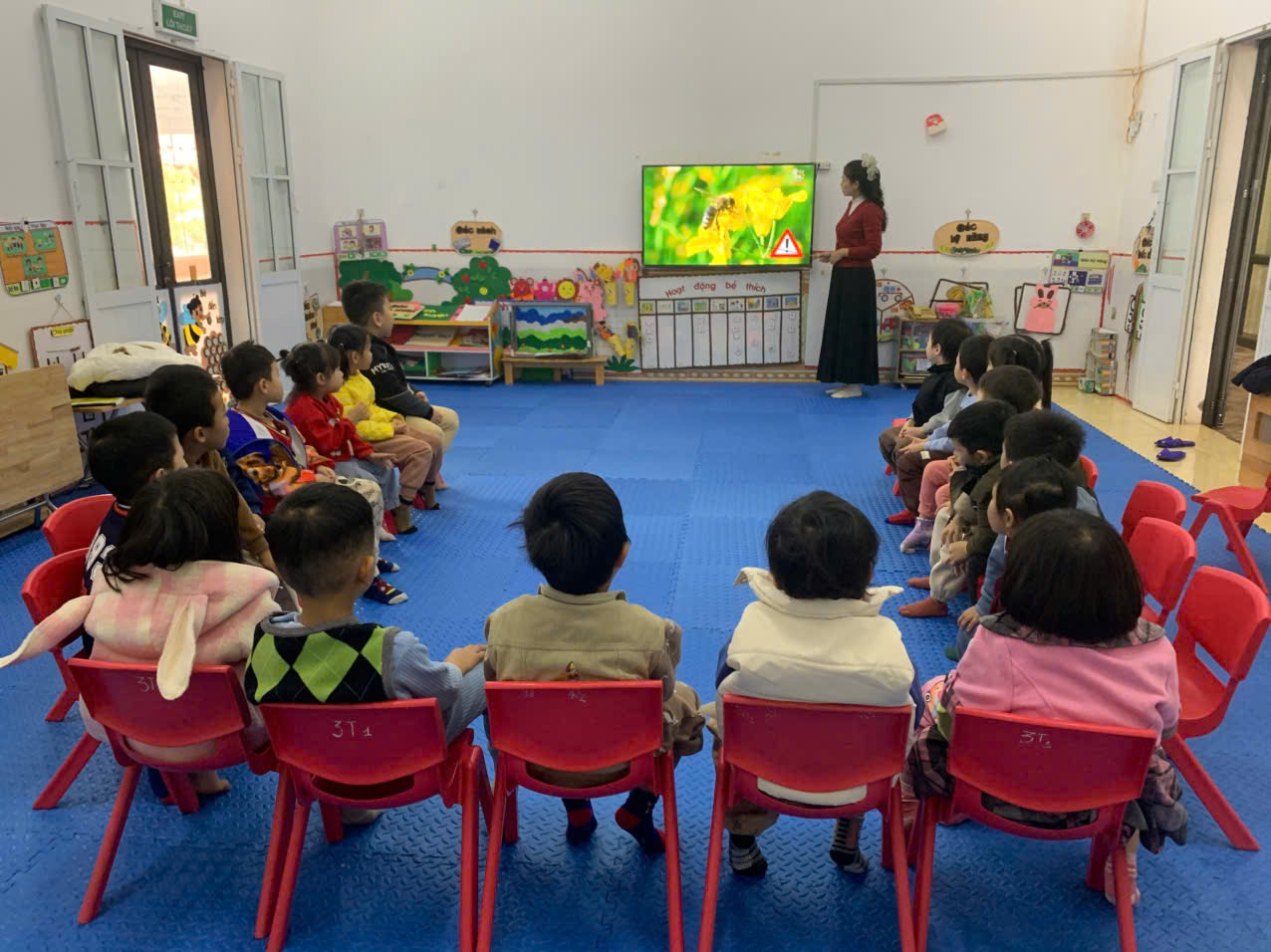 Trong giờ học, cô tổ chức cho các bạn học sinh ngồi theo đội hình ngay ngắn và cùng xem video về những loài côn trùng nguy hiểm. Video giúp trẻ quan sát hình dáng, màu sắc, nơi sống và tác hại của một số côn trùng, từ đó hình thành kỹ năng nhận biết và ý thức phòng tránh.