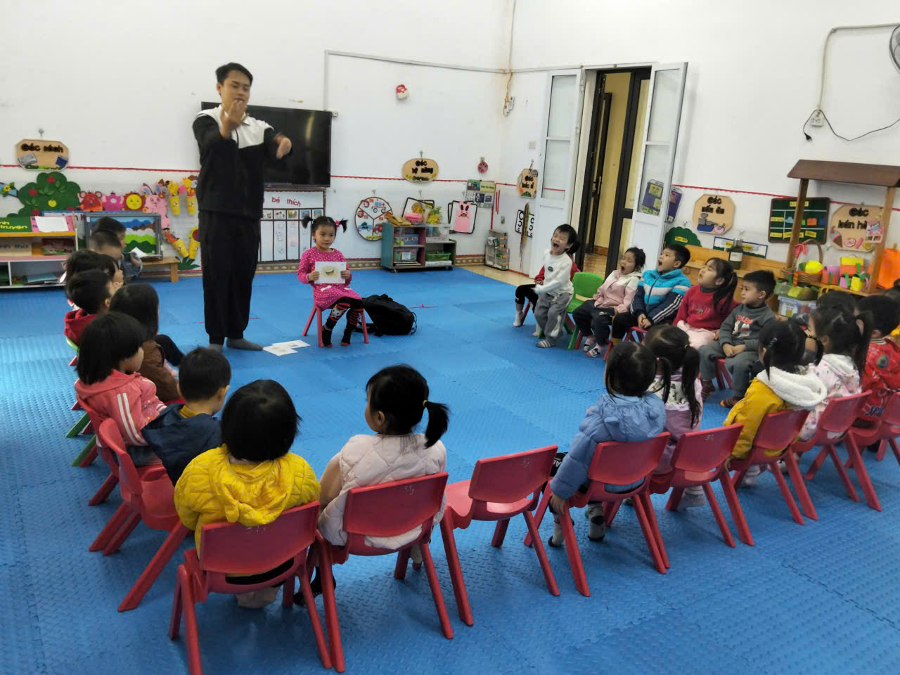Trong giờ học tiếng Anh, thầy giáo tạo không khí vui vẻ, thân thiện để trẻ mạnh dạn tham gia. Trẻ được giới thiệu tên và tuổi của mình bằng tiếng Anh. Thầy dạy trẻ nhận biết và phát âm các từ chỉ bộ phận cơ thể: mắt (eyes), tay (hands), chân (legs), miệng (mouth). Trẻ vừa nghe, vừa chỉ vào các bộ phận trên cơ thể và kết hợp vận động vỗ tay theo hướng dẫn, giúp trẻ ghi nhớ từ vựng tốt hơn.