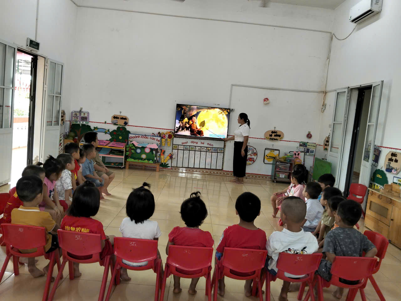 Trong tiết học, cô giới thiệu bài thơ “Ông trăng chị Hằng” giúp trẻ làm quen với hình ảnh quen thuộc của ông trăng và chị Hằng trong đêm Trung thu.Trẻ được nghe cô đọc diễn cảm bài thơ, nhận biết nội dung nói về ánh trăng tròn sáng, chị Hằng xinh đẹp và các bạn nhỏ vui múa hát dưới trăng.Cô hướng dẫn trẻ đọc thơ cùng cô, luyện giọng, nhịp điệu, và diễn cảm qua nét mặt, cử chỉ.Trẻ hứng thú tham gia trò chơi ngôn ngữ, trả lời câu hỏi về nội dung thơ, và cùng nhau vận động minh họa theo nhạc vui tươi.