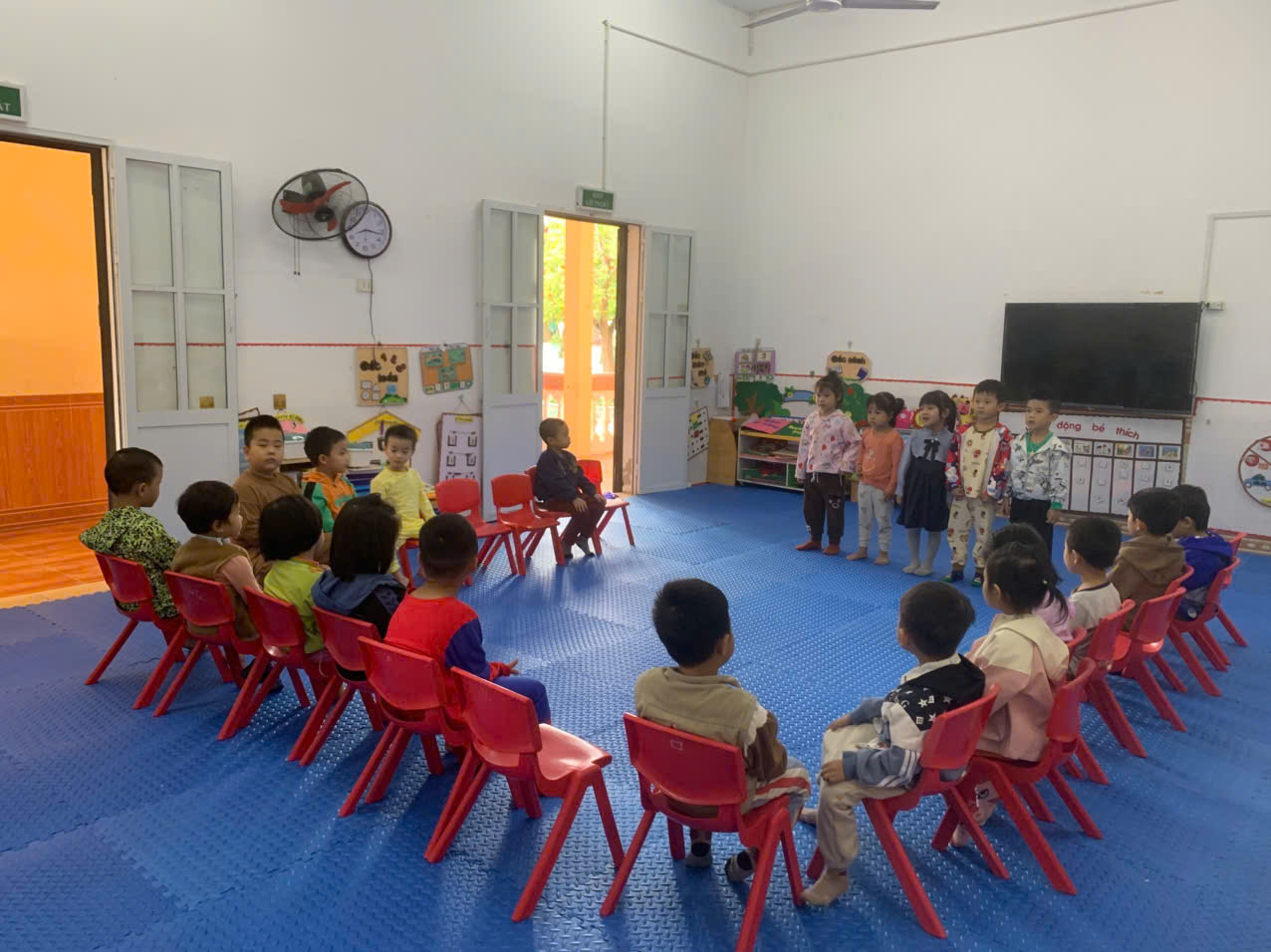 hình ảnh thể hiện hoạt động trẻ đọc thơ theo tổ và cá nhân trong giờ học. Ở phía trước lớp, một nhóm (tổ) trẻ đứng thành hàng ngang, cùng nhau đọc to bài thơ “Em yêu nhà em” với nét mặt vui tươi, hồn nhiên.Ở một hình ảnh khác, một bạn nhỏ được cô mời lên đọc cá nhân, bạn đứng tự tin, hai tay để trước ngực, mắt nhìn cô và các bạn, đọc thơ rành mạch.Các bạn còn lại ngồi phía dưới chăm chú lắng nghe, vỗ tay cổ vũ sau khi bạn đọc xong.