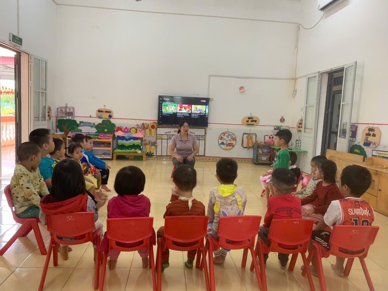 Trong bức ảnh, cô giáo đang kể cho trẻ nghe câu chuyện “Thỏ dọn nhà” bằng tranh vi tính trình chiếu trên màn hình. Cô đứng bên cạnh màn hình, vừa chỉ vào hình ảnh minh họa, vừa kể chuyện bằng giọng diễn cảm, lúc trầm, lúc bổng theo diễn biến của câu chuyện. Trên màn hình hiển thị rõ các cảnh Thỏ quét nhà, lau cửa, sắp xếp đồ đạc gọn gàng. Các bạn nhỏ ngồi phía dưới chăm chú theo dõi, mắt hướng lên màn hình, gương mặt đầy hứng thú. Một vài trẻ giơ tay phát biểu hoặc cười thích thú khi đến đoạn Thỏ hoàn thành việc dọn dẹp. Không khí lớp học sôi nổi, thân thiện, giúp trẻ vừa nghe, vừa quan sát hình ảnh sinh động, qua đó hiểu nội dung và thêm yêu thích việc giữ gìn nhà cửa sạch sẽ.