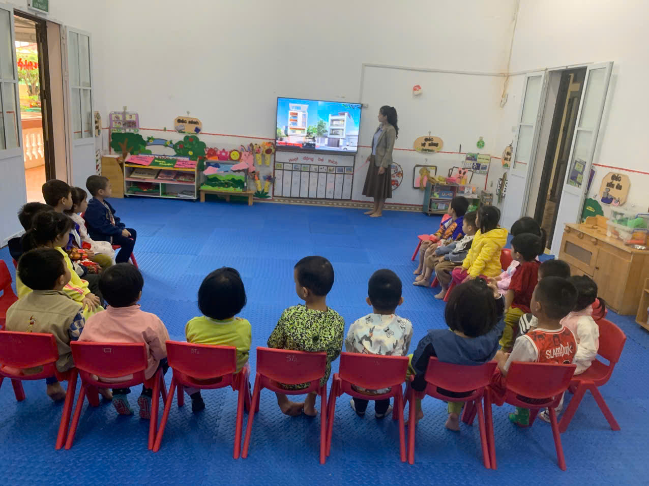 Cô cho trẻ quan sát hình ảnh hoặc video về các kiểu nhà, trò chuyện và đàm thoại để trẻ nêu đặc điểm nổi bật của từng loại (ví dụ: nhà sàn ở vùng núi cao, nhà tầng ở thành phố, nhà mái ngói ở nông thôn…).