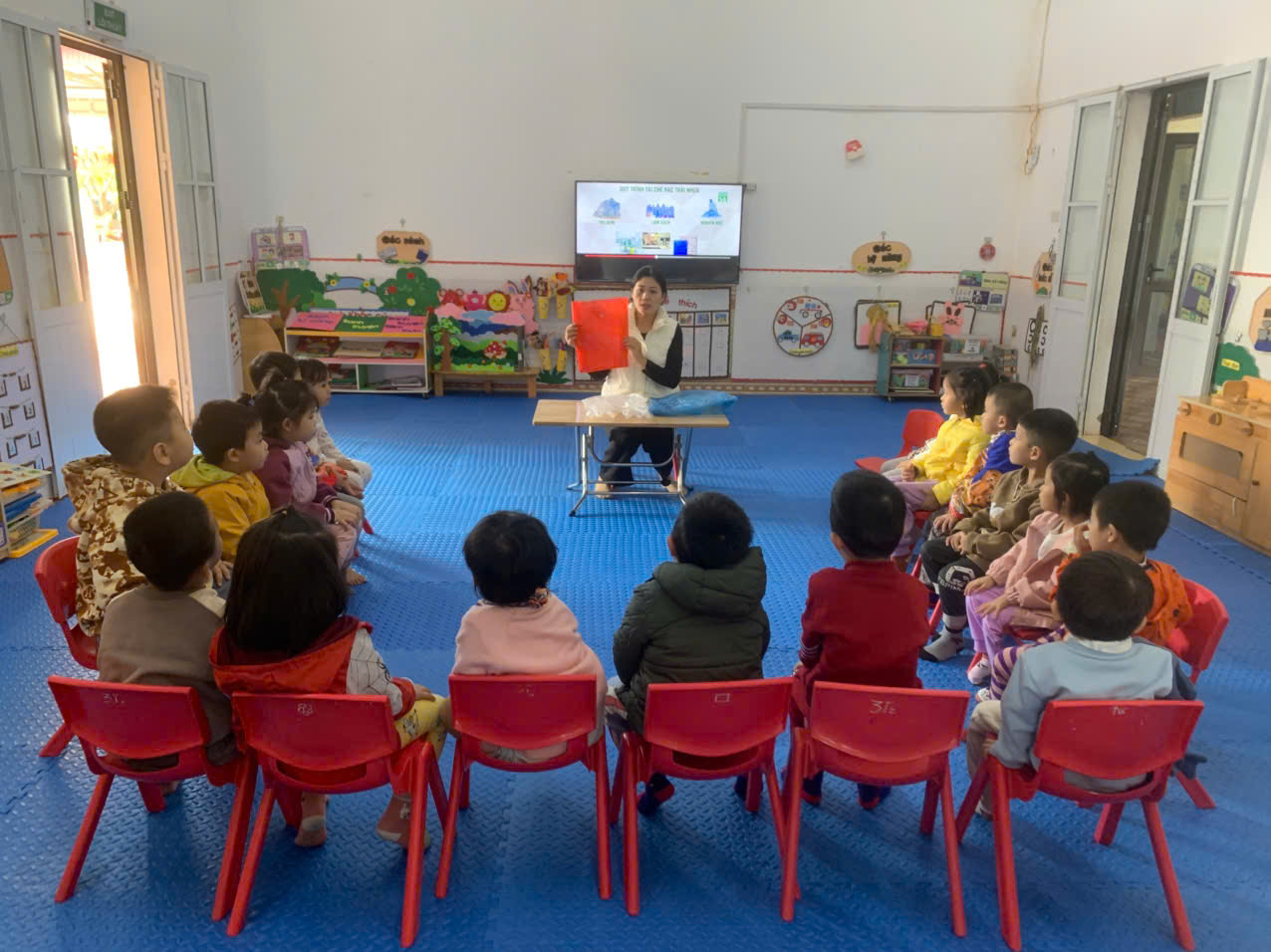 Hình ảnh ghi lại khoảnh khắc cô hướng dẫn trẻ trải nghiệm tái chế túi nilon: các bé đang ngồi theo nhóm nhỏ, trước mặt là những chiếc túi nilon cũ đã được cô chuẩn bị. Cô nhẹ nhàng chỉ dẫn từng bước, từ việc làm sạch túi cho đến cắt – gấp – xoắn để tạo ra sản phẩm mới. Trẻ hào hứng lựa chọn màu túi, cùng nhau thao tác và trao đổi trong lúc làm; có bé đang cắt túi thành sợi, có bé đang buộc thành hoa trang trí hoặc tạo thành túi nhỏ đựng đồ. Không khí hoạt động vui vẻ, sôi nổi, thể hiện sự tập trung và sáng tạo của trẻ trong quá trình tái chế rác thải thành sản phẩm hữu ích.
