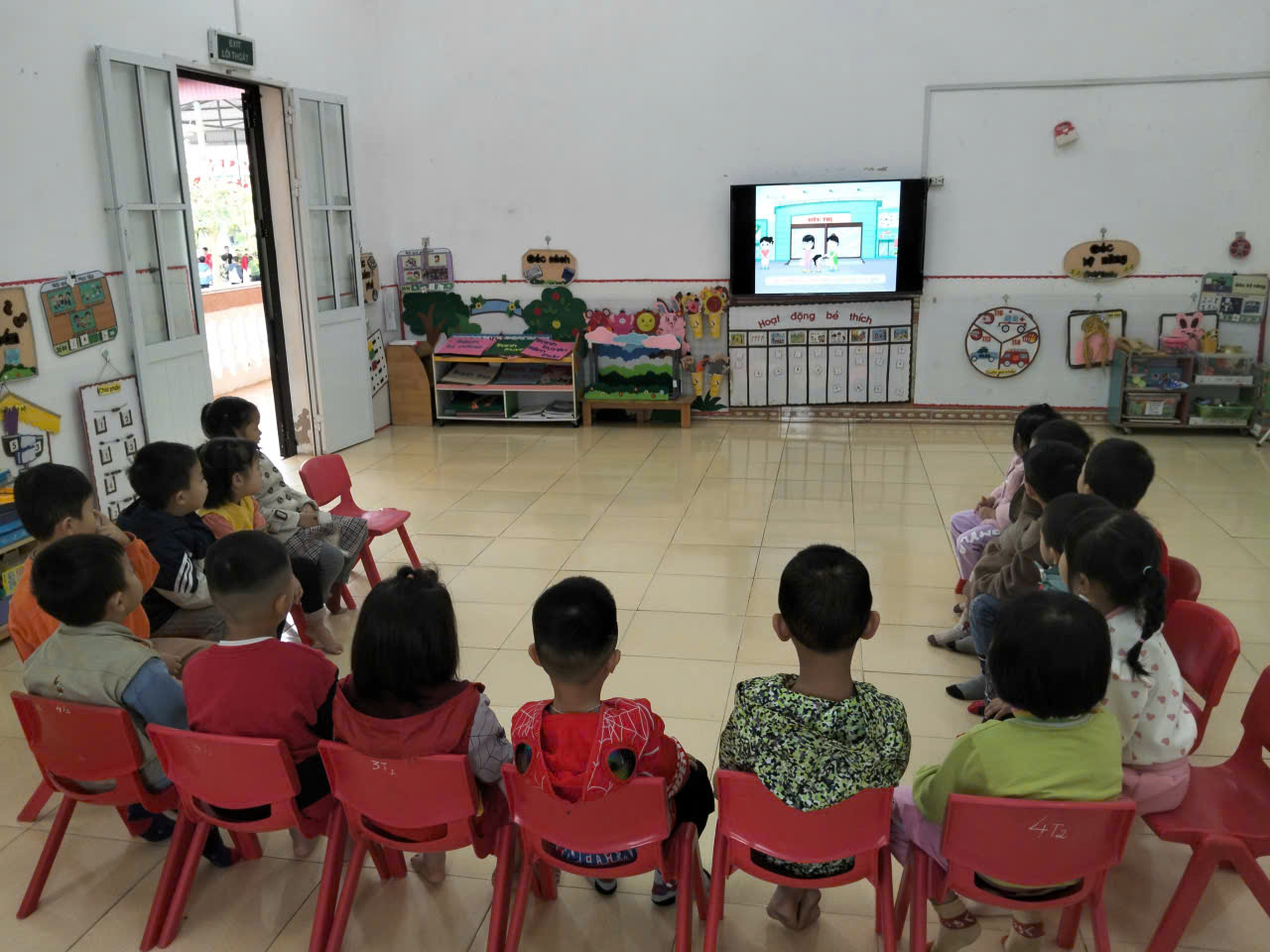 Trong hình, một người lạ mặt (không phải cô giáo hay phụ huynh quen thuộc) bước vào lớp học, trên tay cầm một túi quà hoặc hộp bánh kẹo. Người này mỉm cười và chìa quà ra mời các bé. Một vài trẻ tỏ ra tò mò, nhìn theo túi quà, trong khi một số bé khác lùi lại, tỏ thái độ e dè. tình huống giúp trẻ nhận biết tình huống nguy hiểm tiềm ẩn, biết từ chối lời mời hấp dẫn từ người lạ, và ghi nhớ bài học kỹ năng sống an toàn trong môi trường học đường.