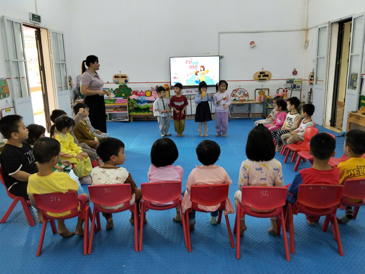 Trong bức ảnh, trẻ đang đứng ngay ngắn, tay và chân phối hợp theo nhịp điệu nhẹ nhàng của bài hát “Cô và mẹ”. Các em thực hiện động tác đưa tay, nghiêng người hoặc bước chân theo đúng hướng dẫn của cô, gương mặt tập trung và vui vẻ. Hình ảnh thể hiện sự chủ động, hứng thú của trẻ khi tham gia vận động, đồng thời cho thấy trẻ biết cảm nhận âm nhạc và thực hiện các động tác một cách nhịp nhàng, đồng đều.