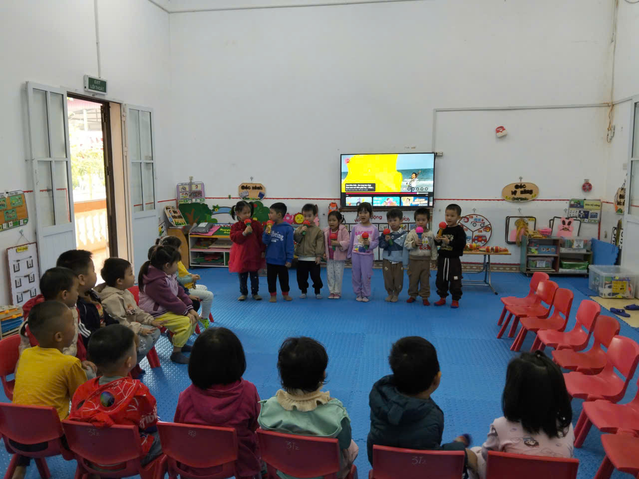 Hình ảnh ghi lại khoảnh khắc trẻ mạnh dạn đứng lên trước lớp, tay cầm micro và tự tin hát bài “Con diều giấy”. Trẻ thể hiện tư thế ngay ngắn, gương mặt vui tươi, ánh mắt hướng về cô và các bạn. Các bạn phía dưới chăm chú lắng nghe, tạo không khí hào hứng và sôi nổi trong giờ học âm nhạc.