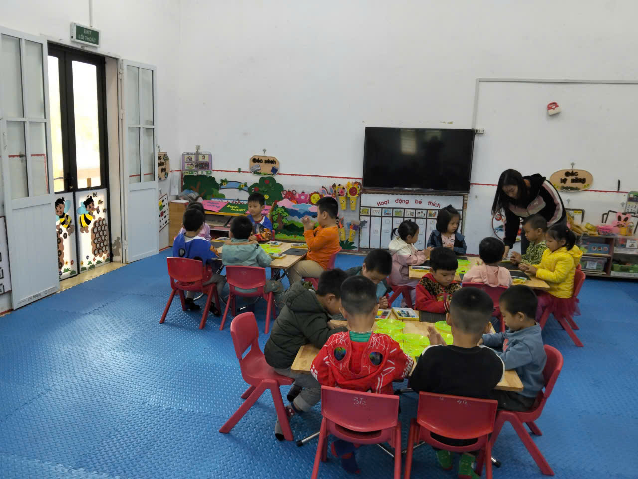Cô hướng dẫn trẻ cách nặn đồ dùng: biết vo tròn, lăn dọc, ấn dẹt, gắn kết các bộ phận để tạo thành sản phẩm (ví dụ: cái bát, cái ấm, cái cốc...). Trẻ tự lựa chọn màu sắc và hình dạng để thể hiện ý tưởng sáng tạo.Trẻ hứng thú tham gia, rèn được kỹ năng nặn cơ bản, phát triển sự khéo léo của đôi tay và hiểu biết về đồ dùng trong gia đình.
