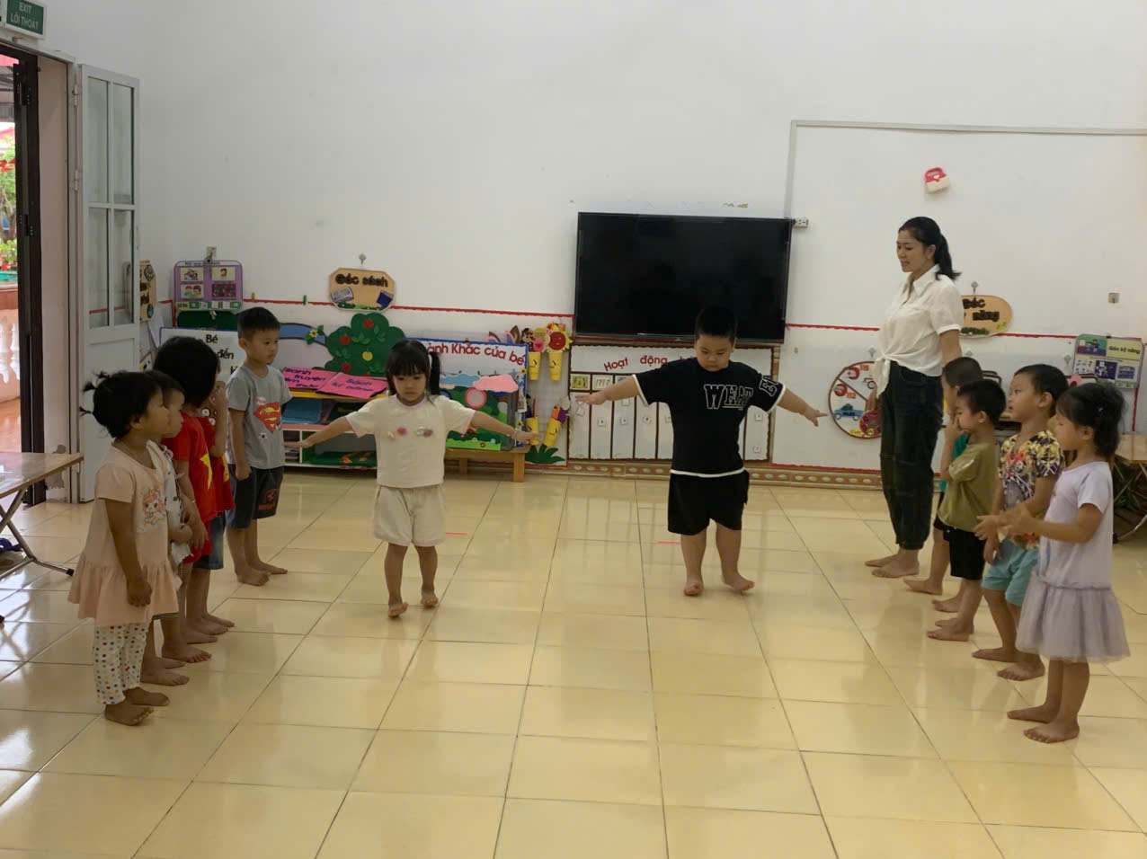 Trong bức ảnh, các bé đang tham gia hoạt động vận động “Đi bằng gót chân”. Trẻ đứng thành hàng, lần lượt bước đi trên sân tập/lớp học với tư thế thẳng người, hai tay đưa ngang hoặc chống hông để giữ thăng bằng. Bàn chân nhón cao, gót chân chạm đất, từng bước đi chậm rãi theo hiệu lệnh của cô giáo. Khuôn mặt trẻ vui vẻ, tập trung, thể hiện sự hứng thú khi rèn luyện kỹ năng vận động.