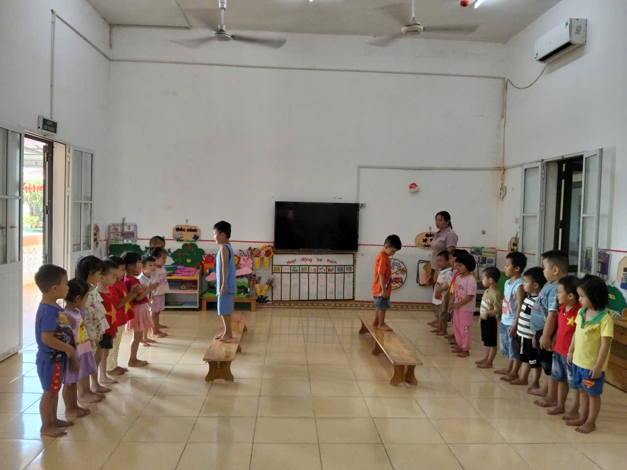 Cô cho trẻ đứng ở đầu ghế thể dục, hai tay dang ngang để giữ thăng bằng.Khi có hiệu lệnh, trẻ bước lên ghế, giữ tư thế thẳng người, mắt nhìn về phía trước.Trẻ thực hiện động tác đi dồn ngang (từng bước nhỏ, di chuyển chậm rãi, chắc chắn) từ đầu này sang đầu kia của ghế.Khi đến hết ghế, trẻ bước xuống nhẹ nhàng, sau đó có thể quay lại thực hiện tiếp hoặc đến lượt bạn khác.Qua bài tập, trẻ rèn luyện khả năng giữ thăng bằng, phối hợp vận động toàn thân, phát triển sự khéo léo và tính mạnh dạn, tự tin khi tham gia hoạt động thể chất.